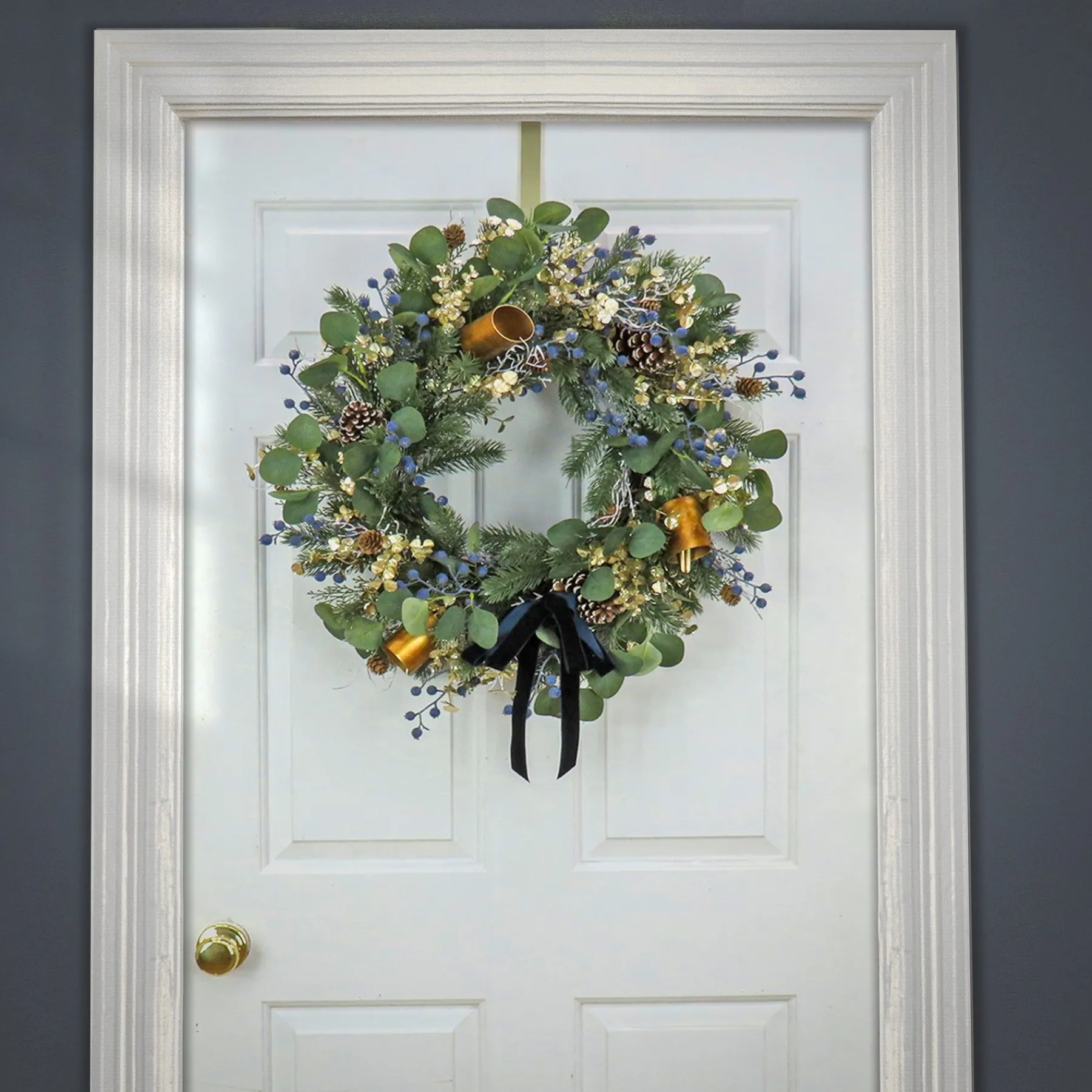 This Swiss Chic Decorated Wreath Features A Mixture Of Evergreen And Bristle Branch Tips Flowing From A Woven Branch Ring Base. It Is Trimmed With Pinecones, Leafy Greens, White Twigs, Clusters Of Blue Berries And Gold Metal Bells. A Black Velvet Ribbon And Bow Add The Finishing Touch. This Colorful And Festive Holiday Wreath Can Be Displayed On Door, Wall, Or Window. Indoor Use Only.
