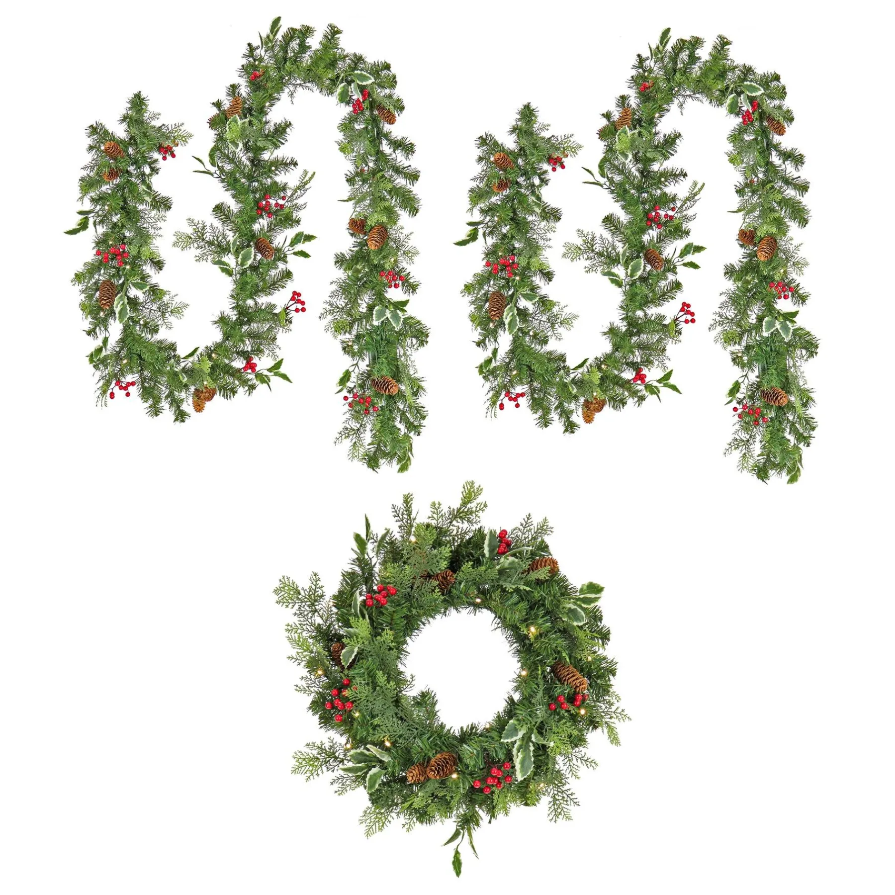 This 3 Piece Assortment Combines Greenery Items Carefully Selected To Simplify Holiday Decorating By Offering A Package Of Coordinated Pieces. Included Are Two 9 Ft. Garlands Each Pre-Lit With 50 Warm White Led Lights And A 24″ Wreath Pre-Lit With 20 Warm White Led Lights.