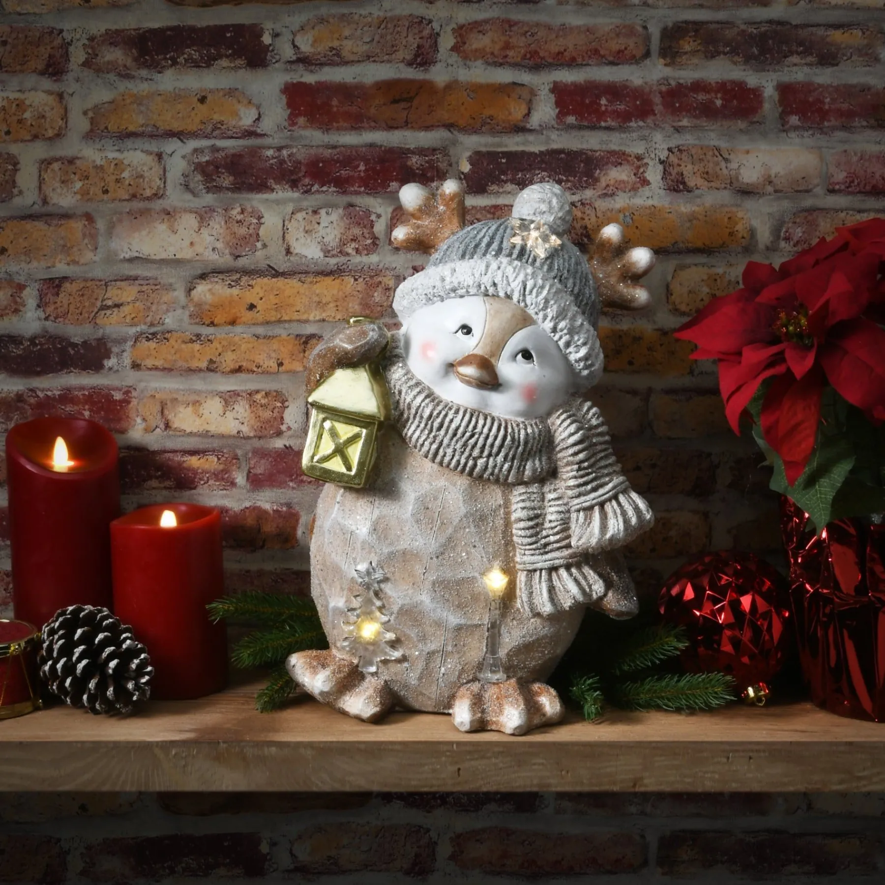 This Whimsical Decoration Is Constructed Of Strong Polyresin Material Featuring Handcrafted Sculpting And Hand-Painted Detail. Ready For Winter Wrapped In A Thick Scarf And Wearing An Antler Ear Cap, This Penguin Is Slighted Tilted With Eyes Up, In A Care-Free Posture. Three Battery-Operated Warm White Led Bulbs Add A Soft Glow Of Light. This Decorative Piece Will Be A Fun Addition To Your Holiday Trimmings.