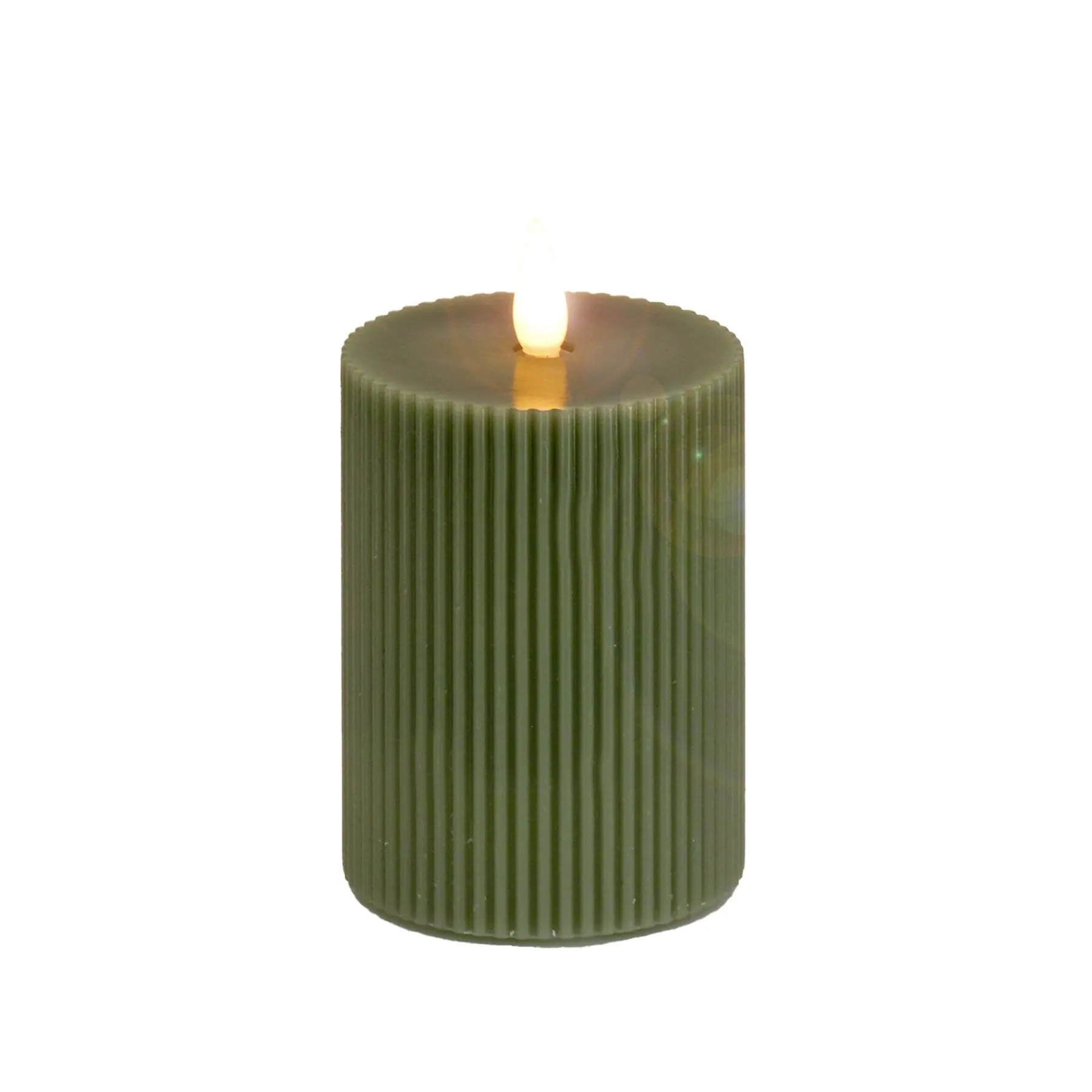 Battery Operated With Remote Controlled Functions, This Flameless Candle Produces A Realistic, Soft, And Safe Candle Glow. The Exterior Surface Is Crafted With Real Wax And Features An Elegant Vertical Ridged Design In An Attractive Dark Green Finish. A Handheld Remote Control Operates The Lifelike Candle Flame With Functions That Include Brightness, Flicker Speed, And Timer Settings. Uses Two C Size Batteries (Not Included).
