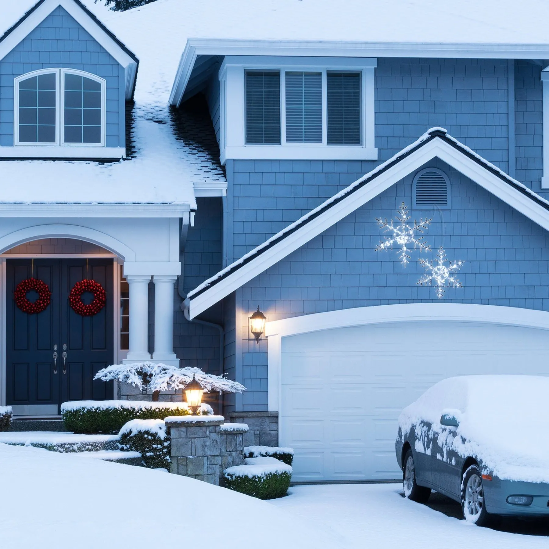 - Get In The Holiday Spirit With This Unique Holiday Decoration That Features Two Snowflakes Of The Same Design But Different Sizes Wrapped With Miniature, Cool White Led Lights