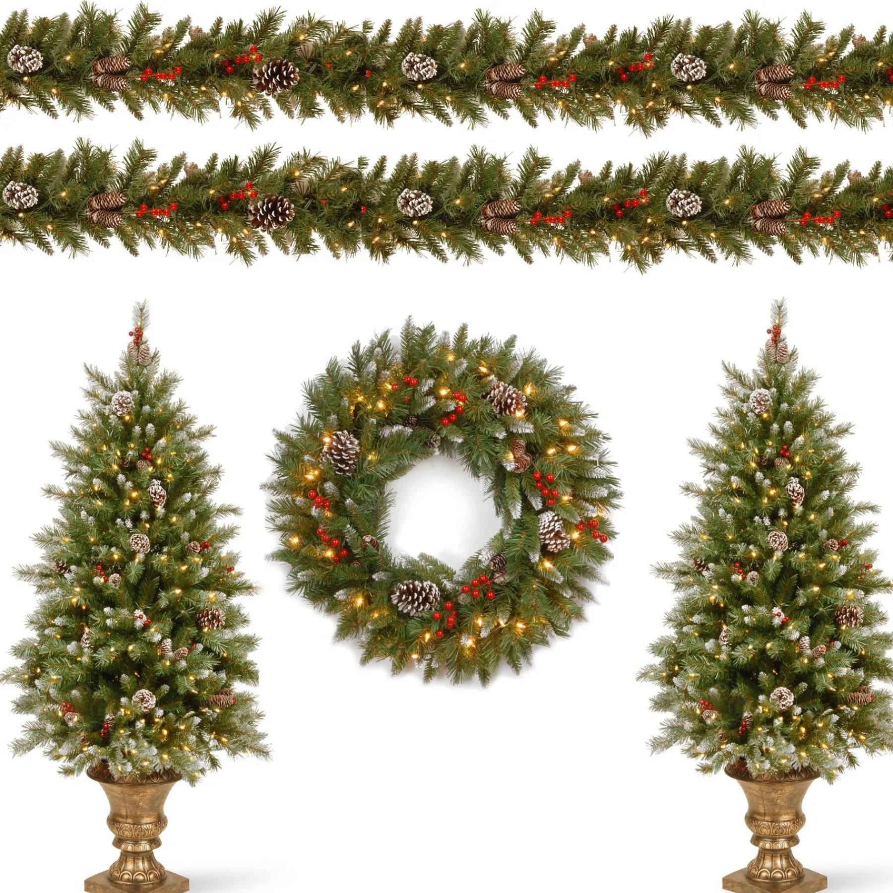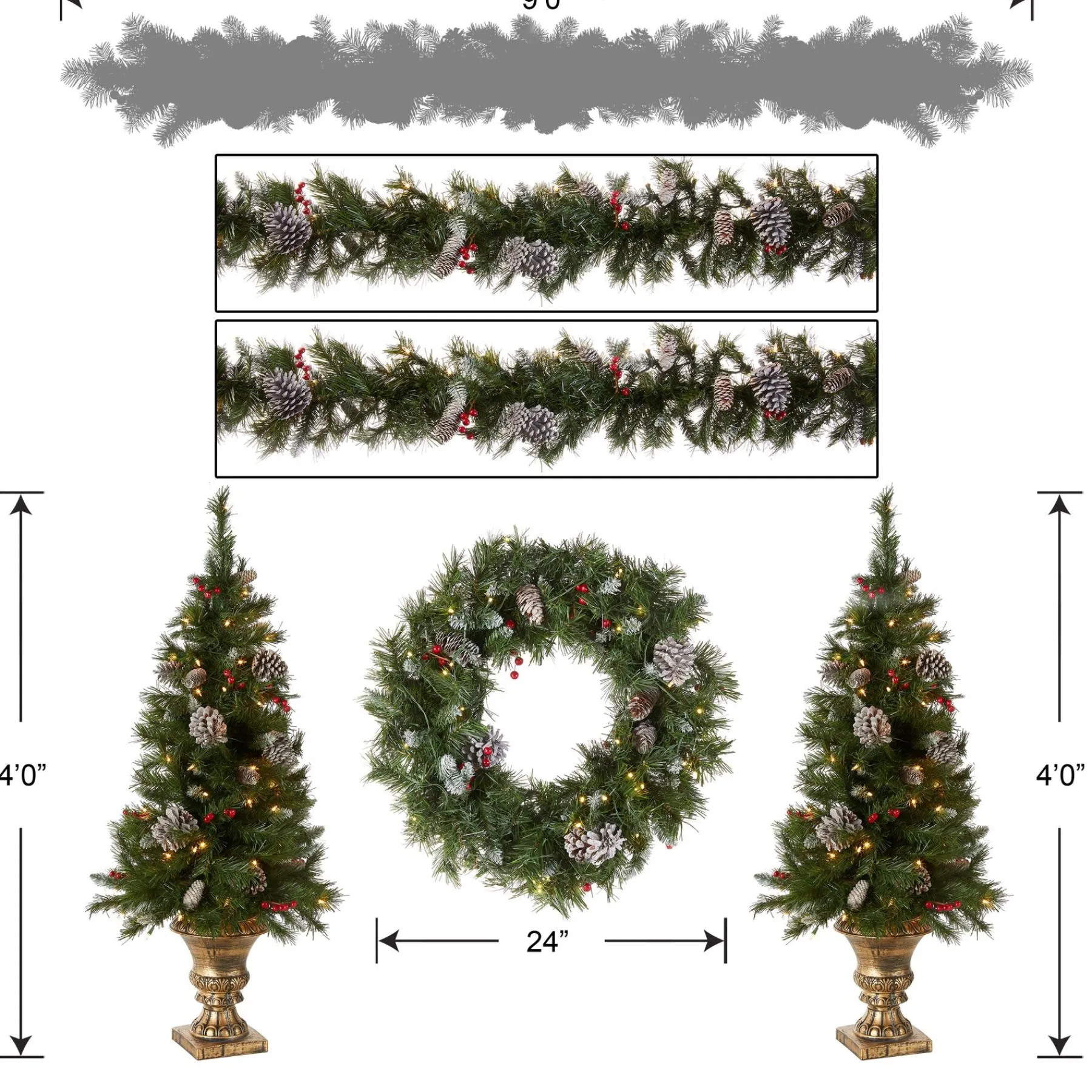 The Frosted Berry Assortment Features Greenery Items Carefully Selected To Simplify Holiday Decorating By Offering A Package Of Coordinated Pieces. Each Item Is Trimmed With Pine Cones And Has Snow Sprinkled Branch Tips. Included Are Two 4 Ft. Entrance Trees Each In A Decorative Urn Base And Pre-Lit With 70 Clear Lights, Perfect For Doorways Or Hallways. Also Included Is A 24″ Wreath Pre-Lit With 50 Battery-Operated Warm White Led Lights, And Two 9 Ft. Garlands Each Pre-Lit With 50 Clear Lights. The Battery-Operated Wreath Includes An Integrated 6 Hours On/18 Hours Off Timer. Both Trees And Garlands Are Plug-In Items, Only Wreath Is Battery Operated. All Pieces Are Rated For Indoor Or Outdoor Use.