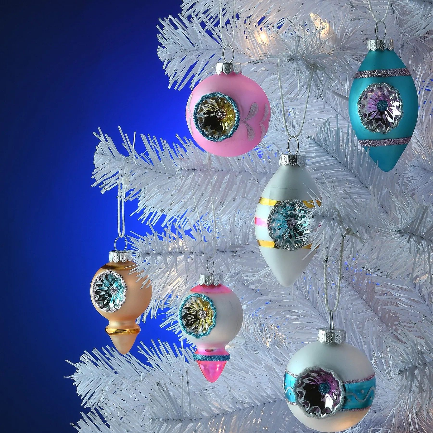 This Set Of 12 Vintage-Style Blown Glass Ornaments Feature A Motif Of Soft Pastel Colors All With Bright Decorative Embossed Centers. Included Are Ball, Teardrop, And Ornate Shapes Many With Hand-Painted, Glittered And, Decorative Embellishments. Boxed In