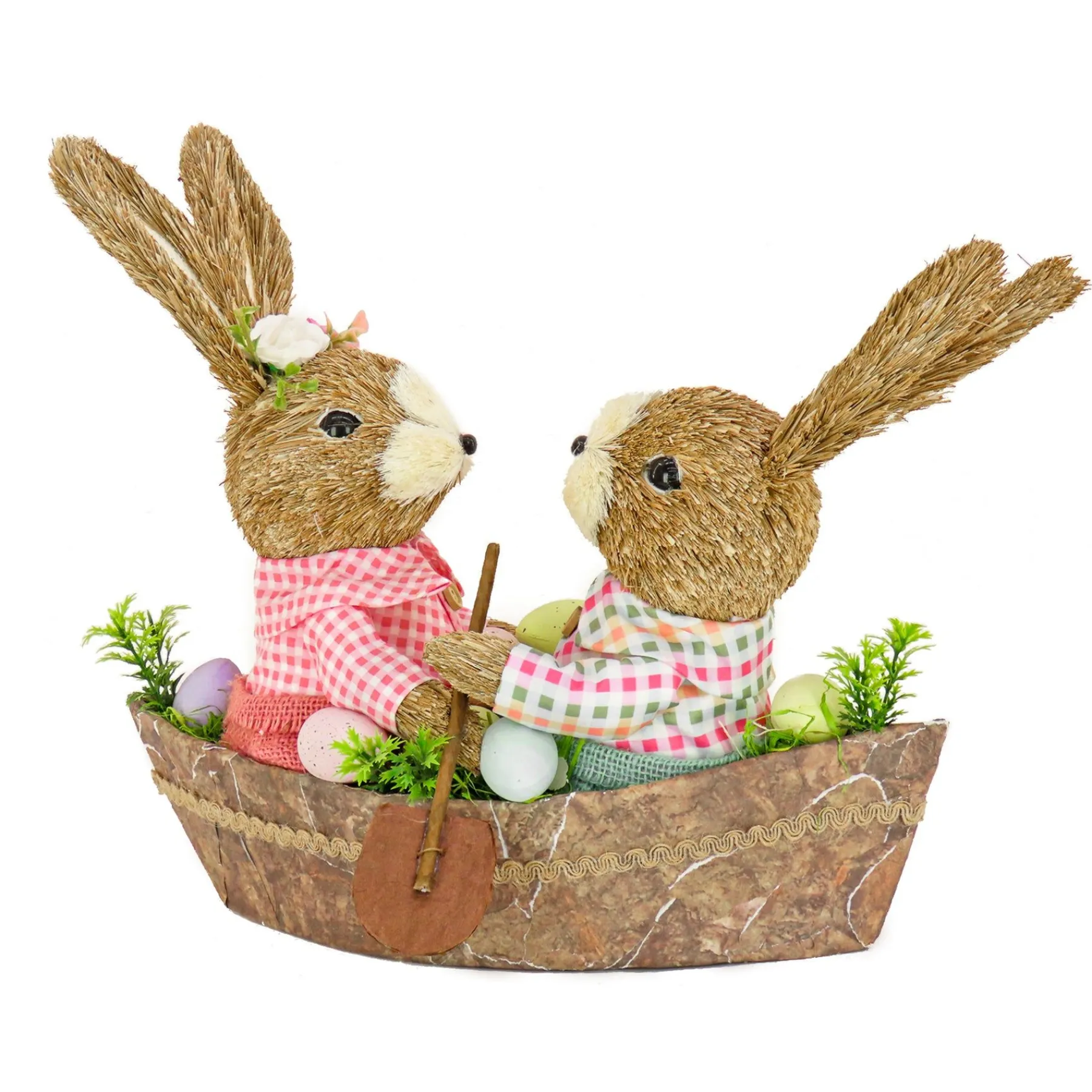 - This Table Decoration Depicts A Bunny Couple Sitting Together In A Boat Shaped Base, Looking Comfortable In Their Checkered Pink Tops And Soft Burlap Bottoms As Colorful Eggs In Assorted Pastel Shades And Sprouts Of Leafy Greens Surround Them