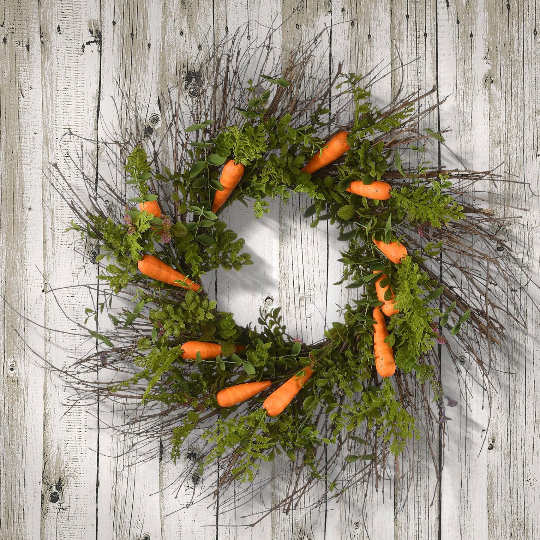 - This Artificial Wreath Decoration Is Decorated With A Swirl Of Wood Branch Tips Flowing From A Woven Branch Ring Base And Trimmed With Bright Orange Carrots Along With Leafy Green Stems For Added Natural Appeal