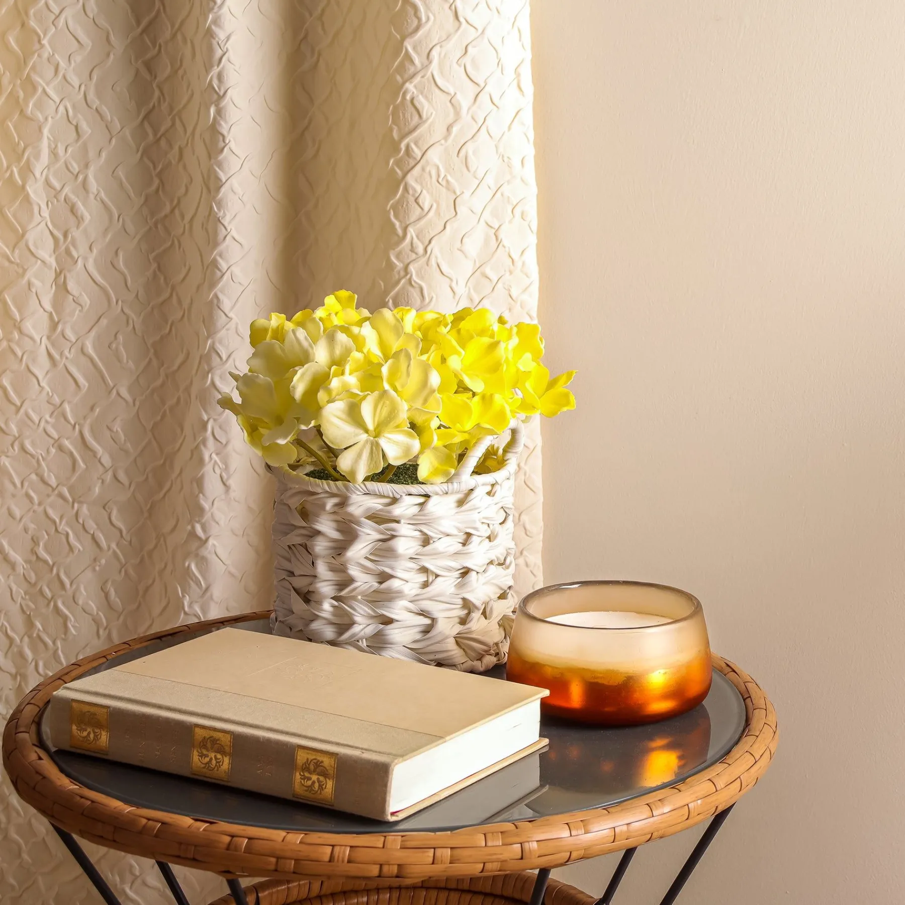 This Bouquet Of Light Yellow Hydrangea Flower Blooms Rises From A White Basket With A Wide Weave And Two Loop Handles. The Flowers Are Seated In A Simulated Soil Surface. Add A Burst Of Color To Tabletop Trimmings With These Attractive Artificial Flowers That Are Remarkably Life-Like Yet Maintenance-Free. For Decorative Indoor Display.