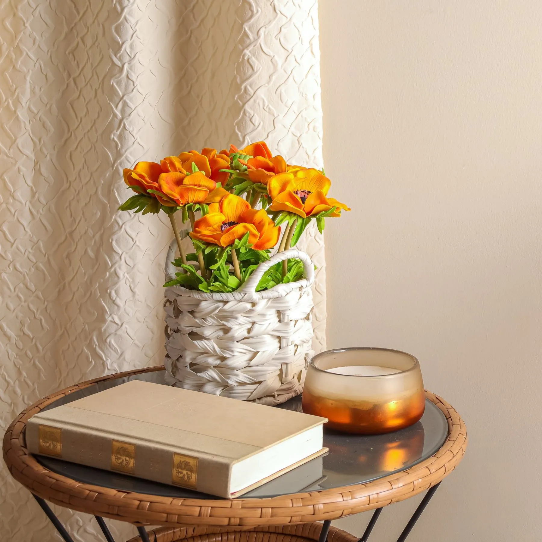 This Bouquet Of Orange Anemone Flower Blooms On Leafy Green Stems Rises From A White Basket With A Wide Weave And Two Loop Handles. The Flowers Are Seated In A Simulated Soil Surface. Add A Burst Of Color To Tabletop Trimmings With These Attractive Artificial Flowers That Are Remarkably Life-Like Yet Maintenance-Free. For Decorative Indoor Display.
