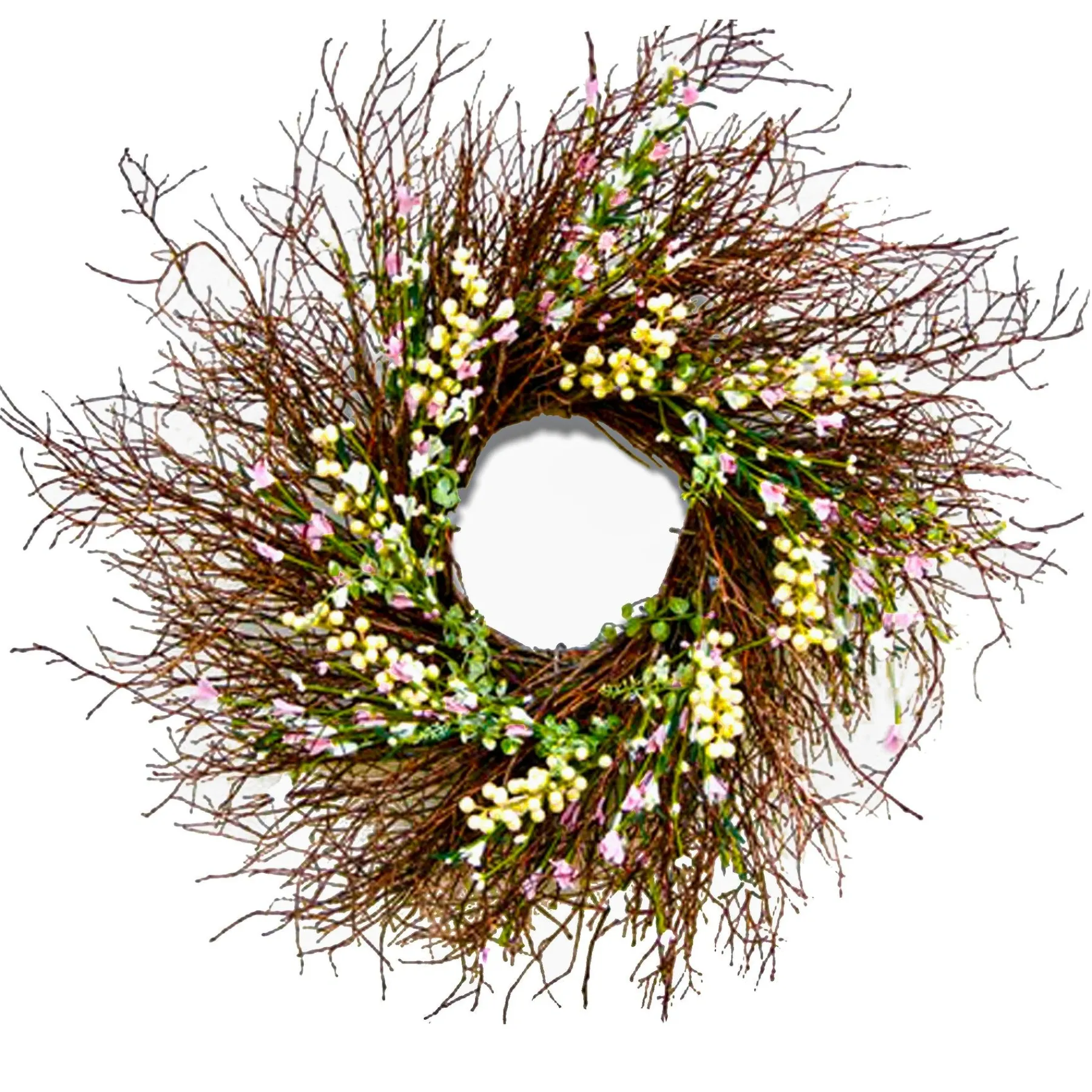 This Wreath Features A Swirl Of Bristle Twigs Spiraling Out From A Woven Branch Ring Base. It Is Decorated With Light Pink And Cream-Colored Forsythia Flowers Atop Long Flowing Stems. A Mixing Of Berry Clusters And Leafy Greens Add Natural Appeal.