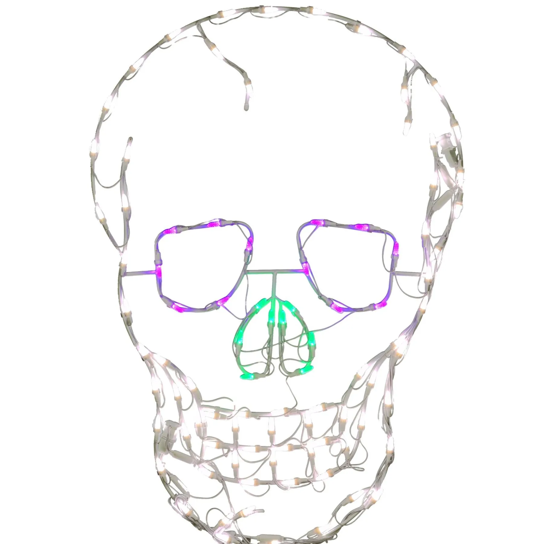 - The Decoration Depicts A Frame Shaped In The Outline Of An Eerie Skull. The Lights Attached Glow Brightly In A Combination Of Purple, White And Green Bulbs. To Power The Lights, Simply Plug Into The Nearest Wall Outlet