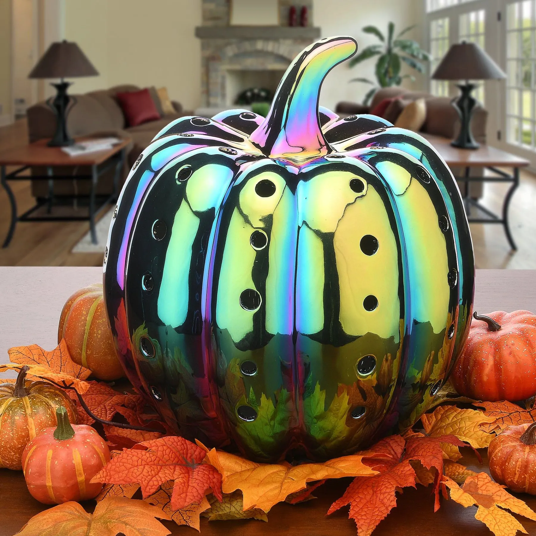 This Autumn Decoration Is Constructed Of Ceramic And Finished In A Reflective Iridescent Finish With A Purple Luster. Small Round Openings Are Cutout Along The Sides That Allow A Multicolor Led Light To Shine From Inside Giving Off A Warm Glow. Bulb Is Ba