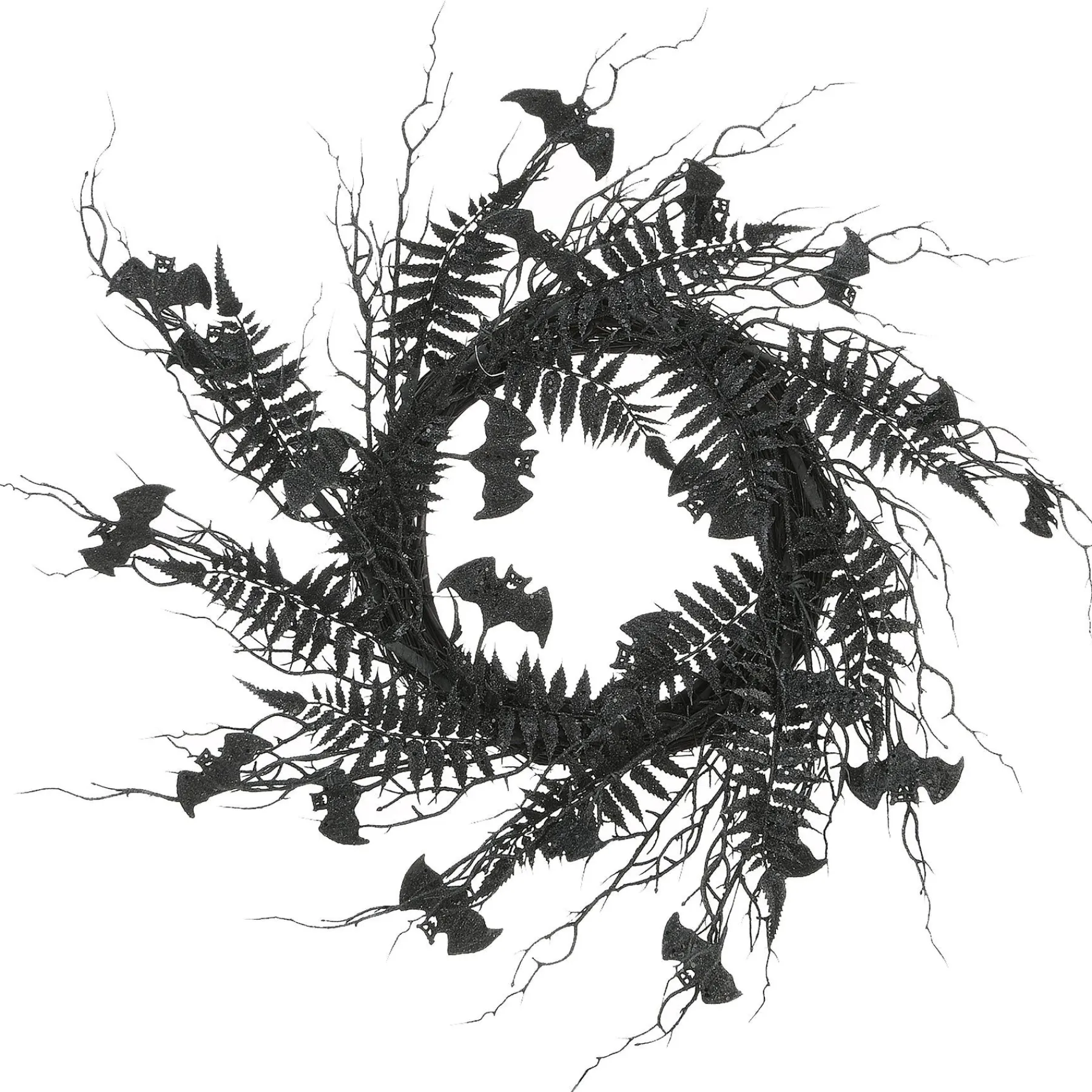 - Halloween-Themed Wreath Made With A Woven Black Branch Base And Decorated With Miniature Bats. The Arrangement Is Supplemented With Black Fern Leaves And Twigs.