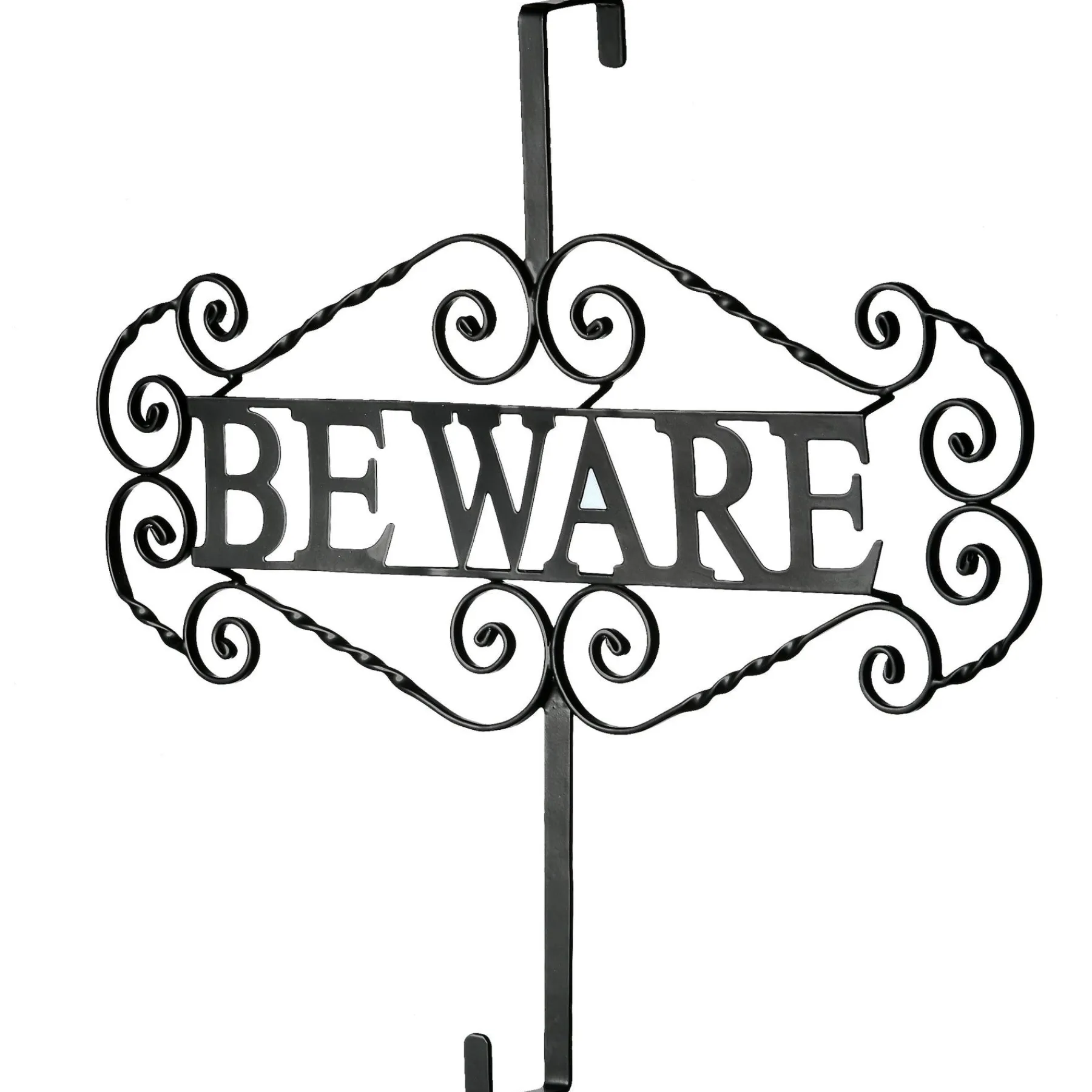- Halloween-Themed Wreath Hanger Made With An Ornately Crafted “Beware” Sign. The Metal Words Sit Above Any Wreath That Is Placed In The Hanger.