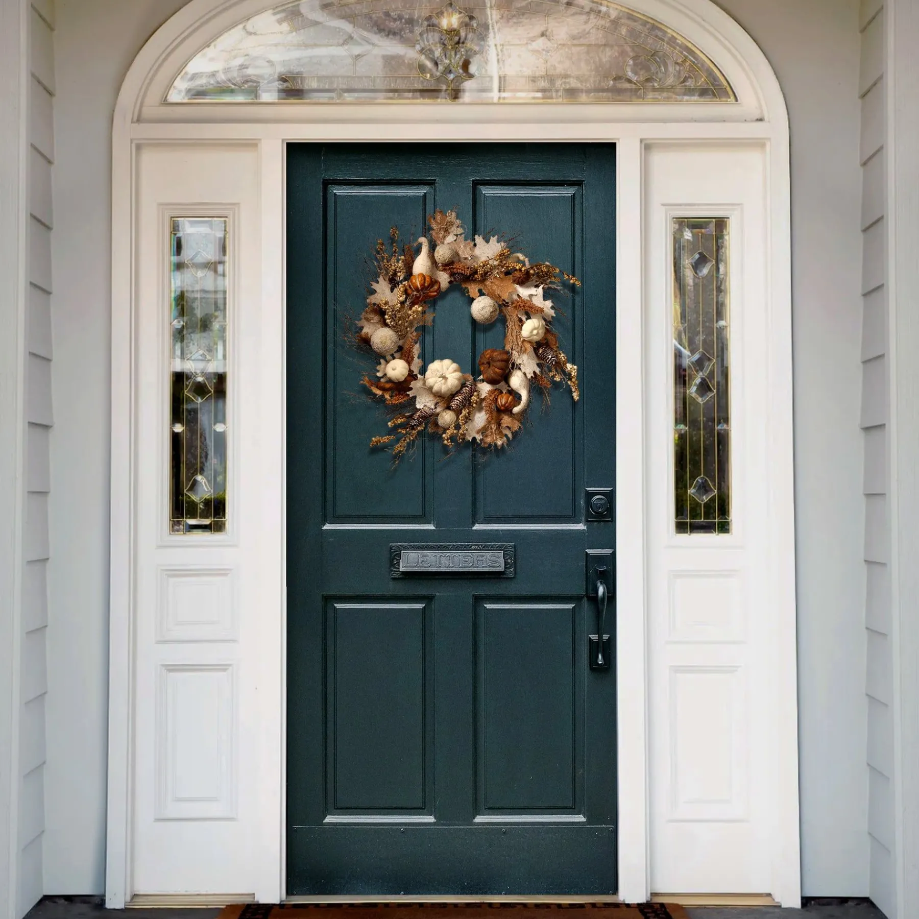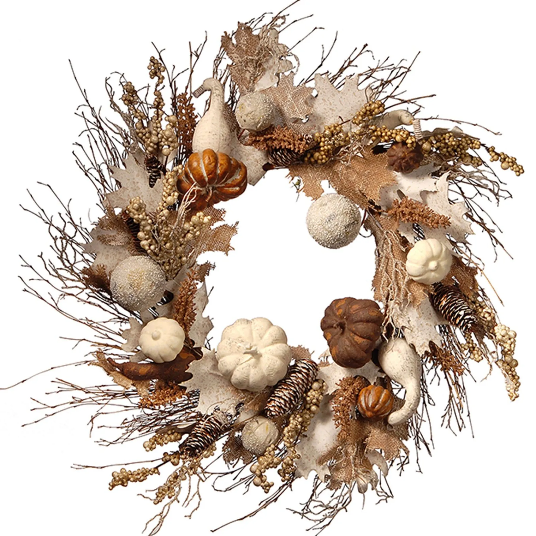 This Wreath Features Assorted Leaves In A Handsome But Subdued White Hues Flowing From A Woven Branch Base With Individual Twigs Spread Out From Center. It Is Trimmed With Gourds, Pinecones And Berry Clusters In Complimenting Colors.