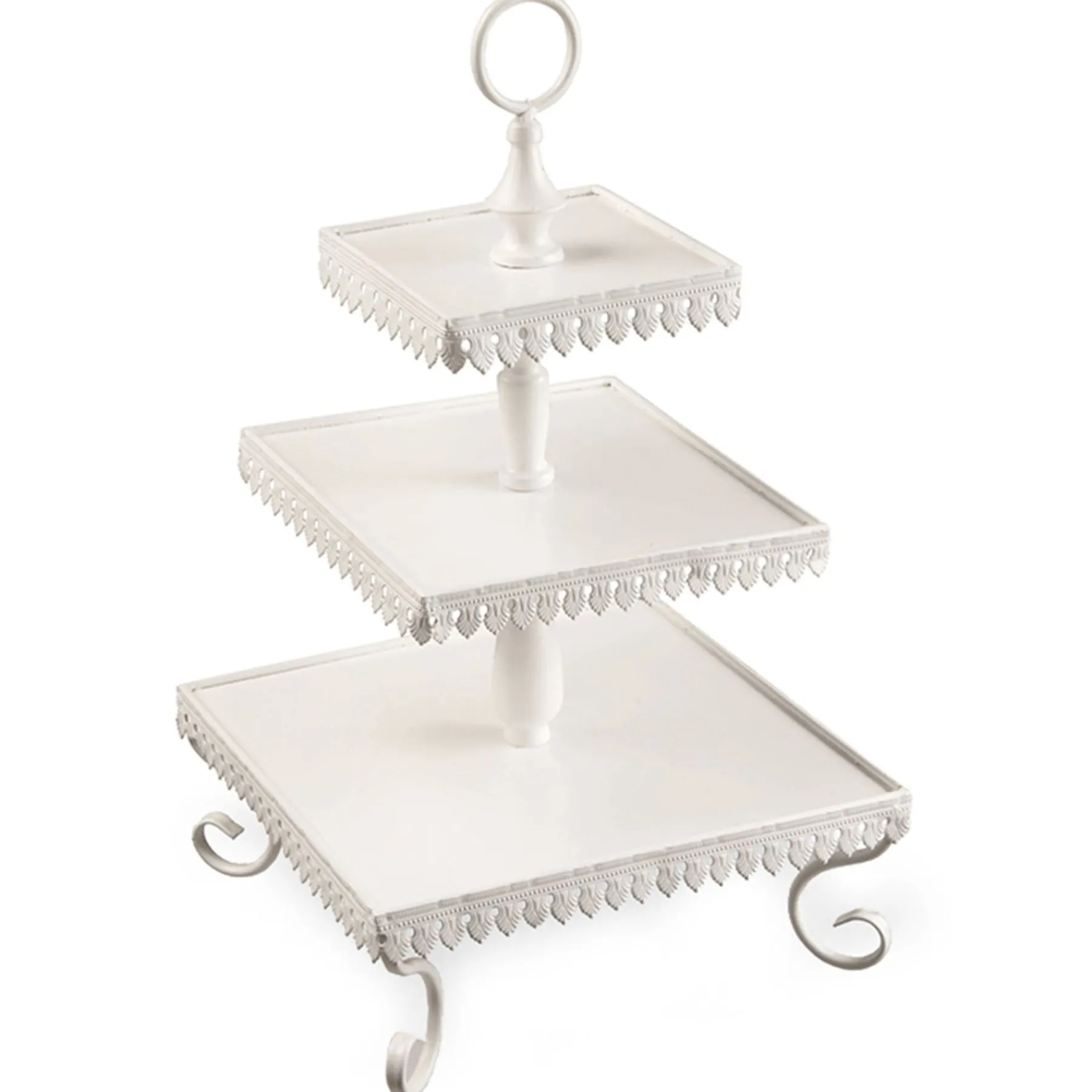 This Three-Level Service Piece Is Constructed Of All Metal Components Finished In Bright White Enamel. Each Plate Is Lined With An Ornate Trimming To Add An Elegant Design Element. Use This Decorative Piece For Food Servings At Weddings, Engagements And Other Similar Special Occasion Celebrations. Some Assembly Required.