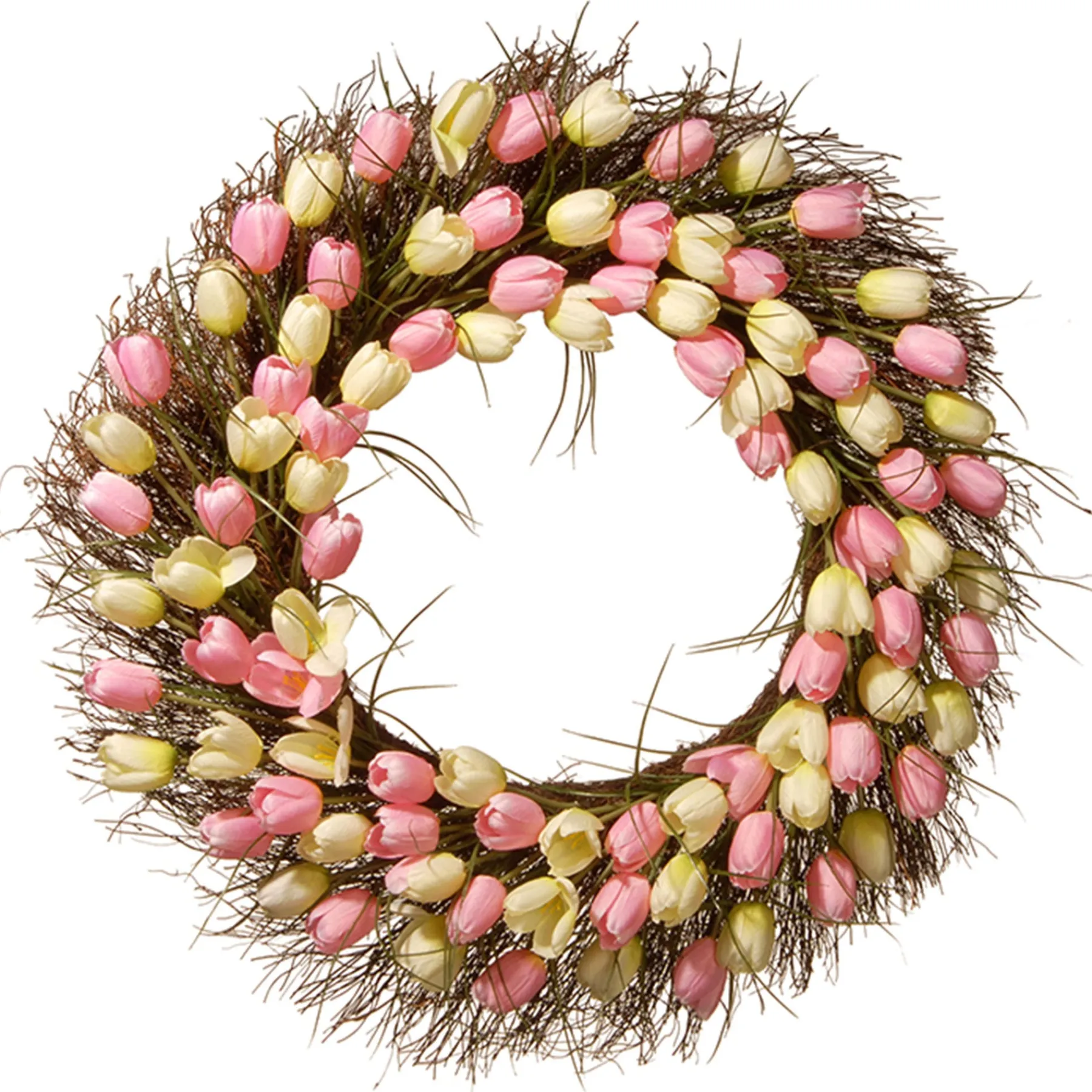 National Tree Company Flower Wreaths^ Artificial Hanging Wreath, Woven Branch Base, Decorated With Yellow And Pink Tulip Blooms, Flowing Green Stems, Spring Collection, 32 Inches