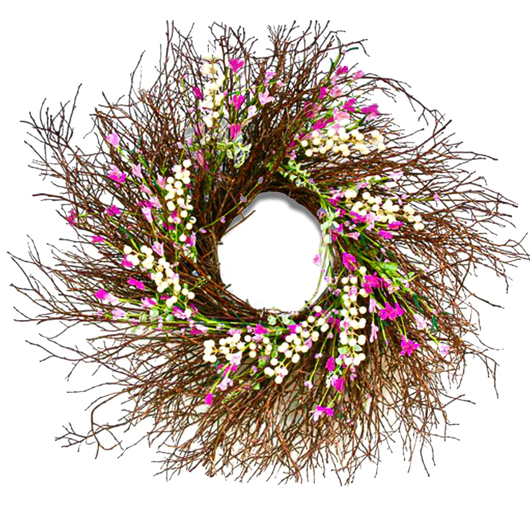 This Wreath Features A Swirl Of Bristle Twigs Spiraling Out From A Woven Branch Ring Base. It Is Decorated With Dark Pink And Cream-Colored Forsythia Flowers Atop Long Flowing Stems. A Mixing Of Berry Clusters And Leafy Greens Add Natural Appeal And Complimenting Colors. Display This Attractive Decoration On Doors, Walls And Windows In Indoor Or Covered Outdoor Locations.