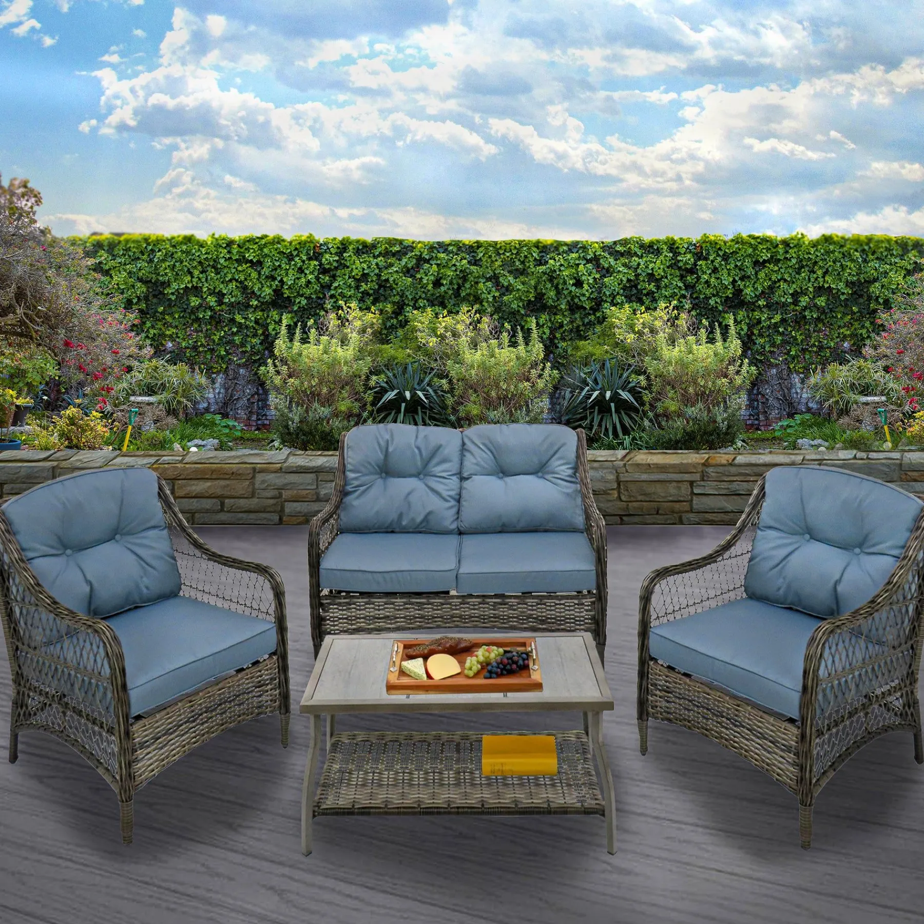 This Indoor/Outdoor Chat Set Is Constructed With Strong Aluminum Framing Wrapped In All-Weather Pe Rattan-Wicker Material That Is Durable And Long Lasting. Each Piece Features A Combination Of Wicker Weave And Wicker Net Styling In Gray Colors, All Designed To Withstand Harsh Outdoor Elements. Pieces Will Not Unravel, Fray, Or Fade. Both Chairs And Loveseat Have Armrests And All Three Include Comfortable, Complementing Removable Gray Cushions That Are Fashioned With Water, Mildew, And Fade-Resistant Fabric. A Sturdy, Matching Two-Tier Table With A Tiled Top Surface Completes The Set. Pieces Are Easy To Maintain And Care For. Some Assembly Required.