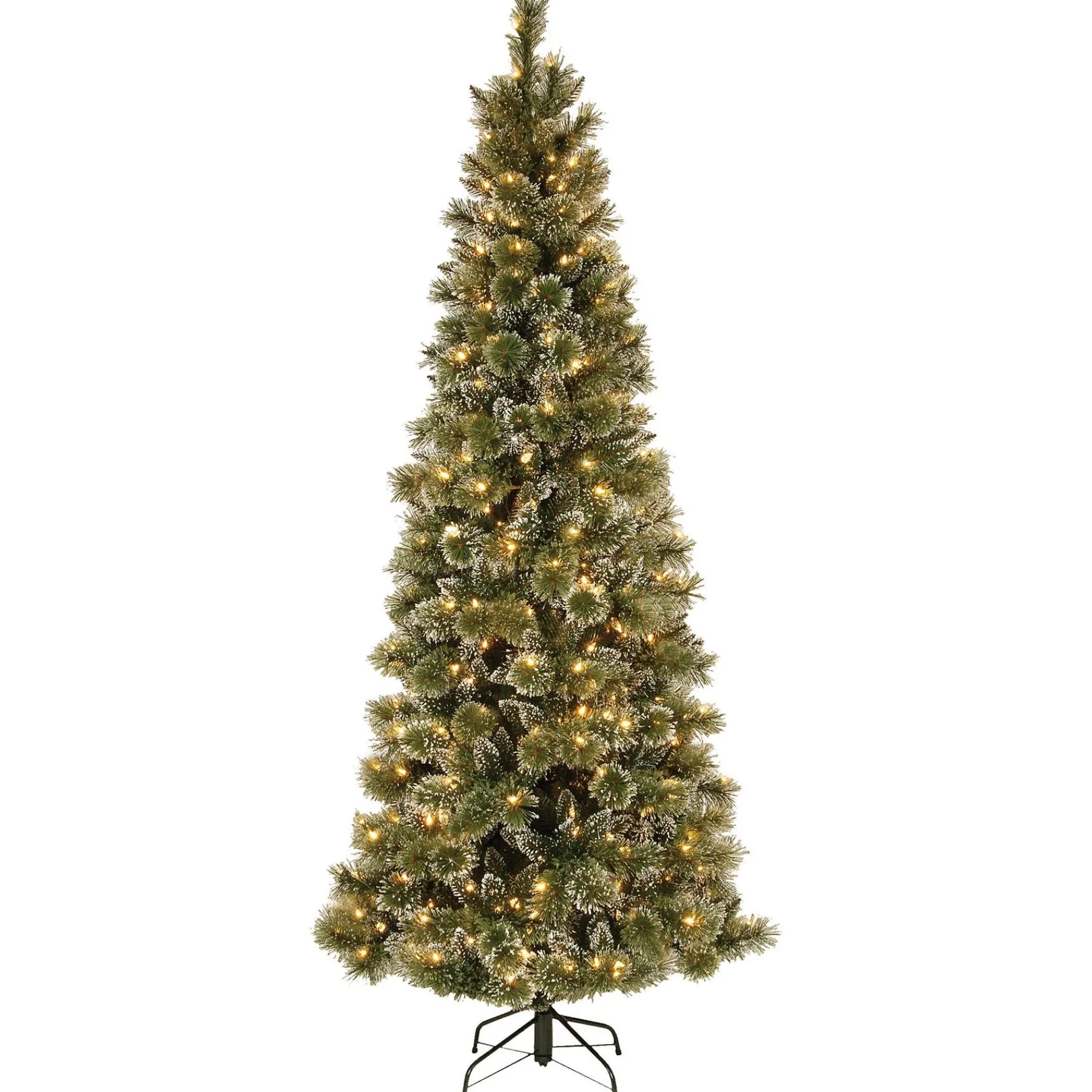 Slim-National Tree Company Pre-Lit Artificial Slim Christmas Tree, Green, Glittery Bristle Pine, White Lights, Includes Stand, 7.5 Feet