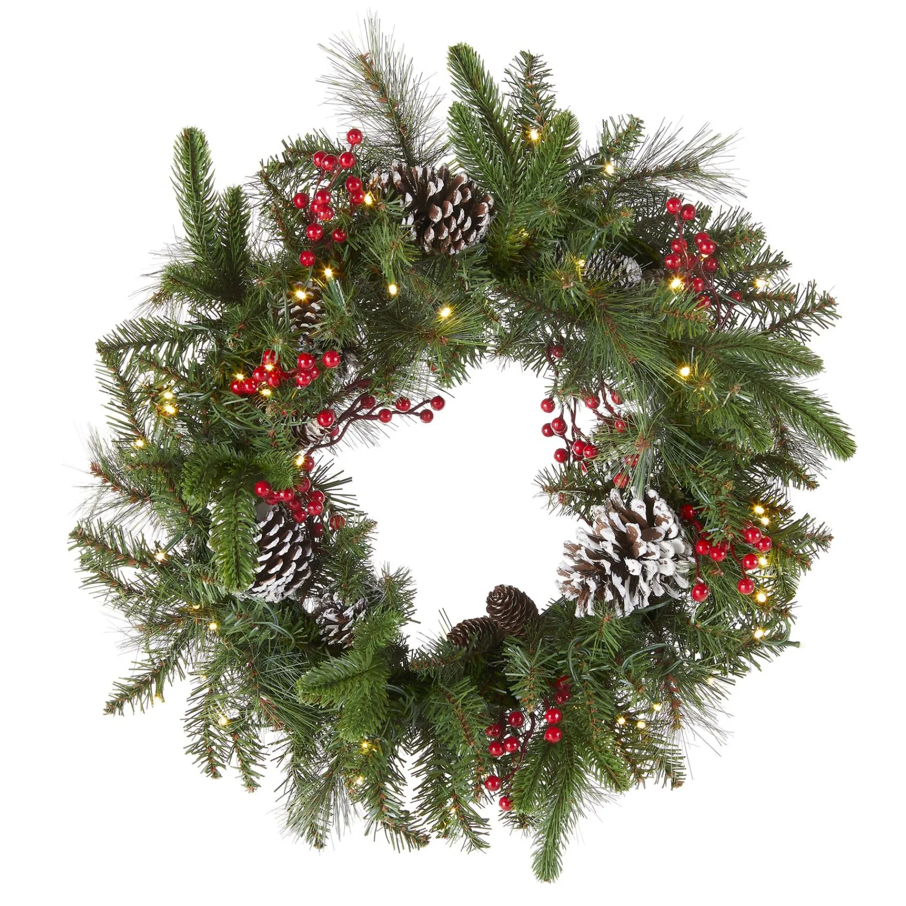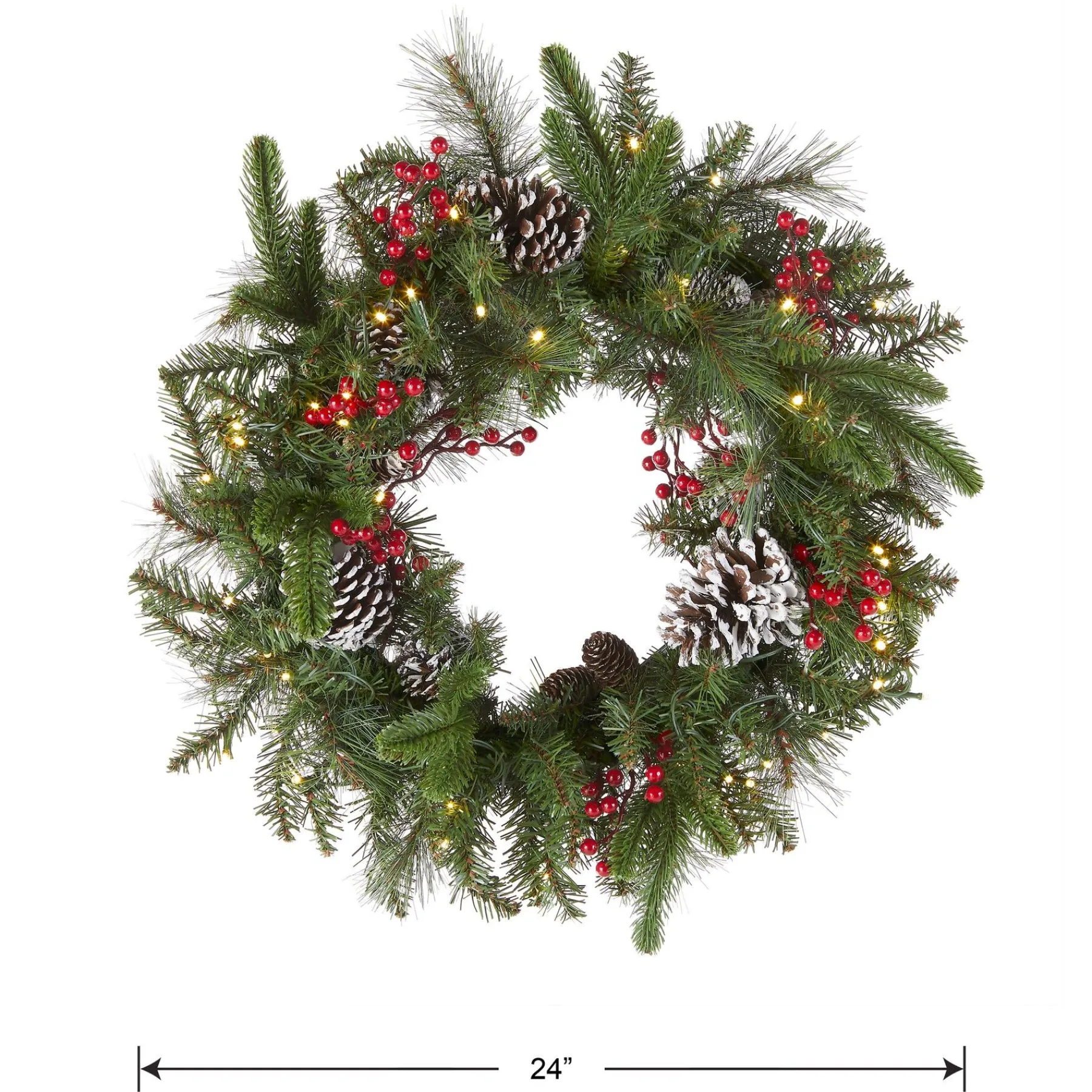 This Bristle Berry Wreath Features Feel RealĀ® Branch Tip Technology, Creating A Decoration With Remarkable Realism. This Mixed Evergreen Tip Wreath Is Trimmed With Red Berries And Pine Cones. It Is Pre-Strung With 50 Battery-Operated Warm White Led Lights That Are Energy-Efficient And Long Lasting. 6 Hours On/18 Hours Off Timed Operation. This Wreath Can Be Displayed On Doors, Walls And Windows In Indoor Or Covered Outdoor Locations.