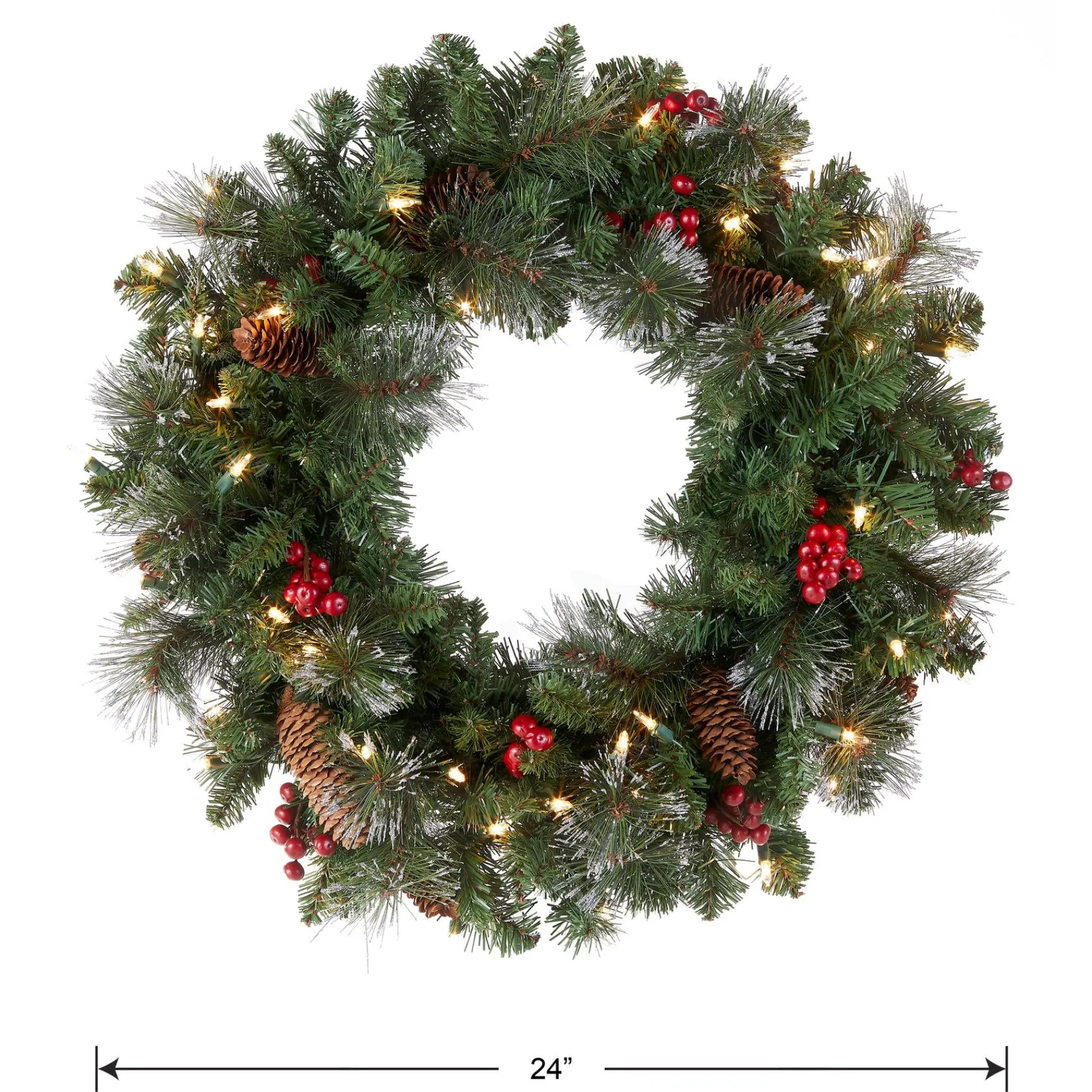 - Designed With A Crestwood Spruce Branch Base, This Pre-Lit Artificial Christmas Wreath Is 24 Inches Wide And Decorated With Pine Cones And Berry Clusters.