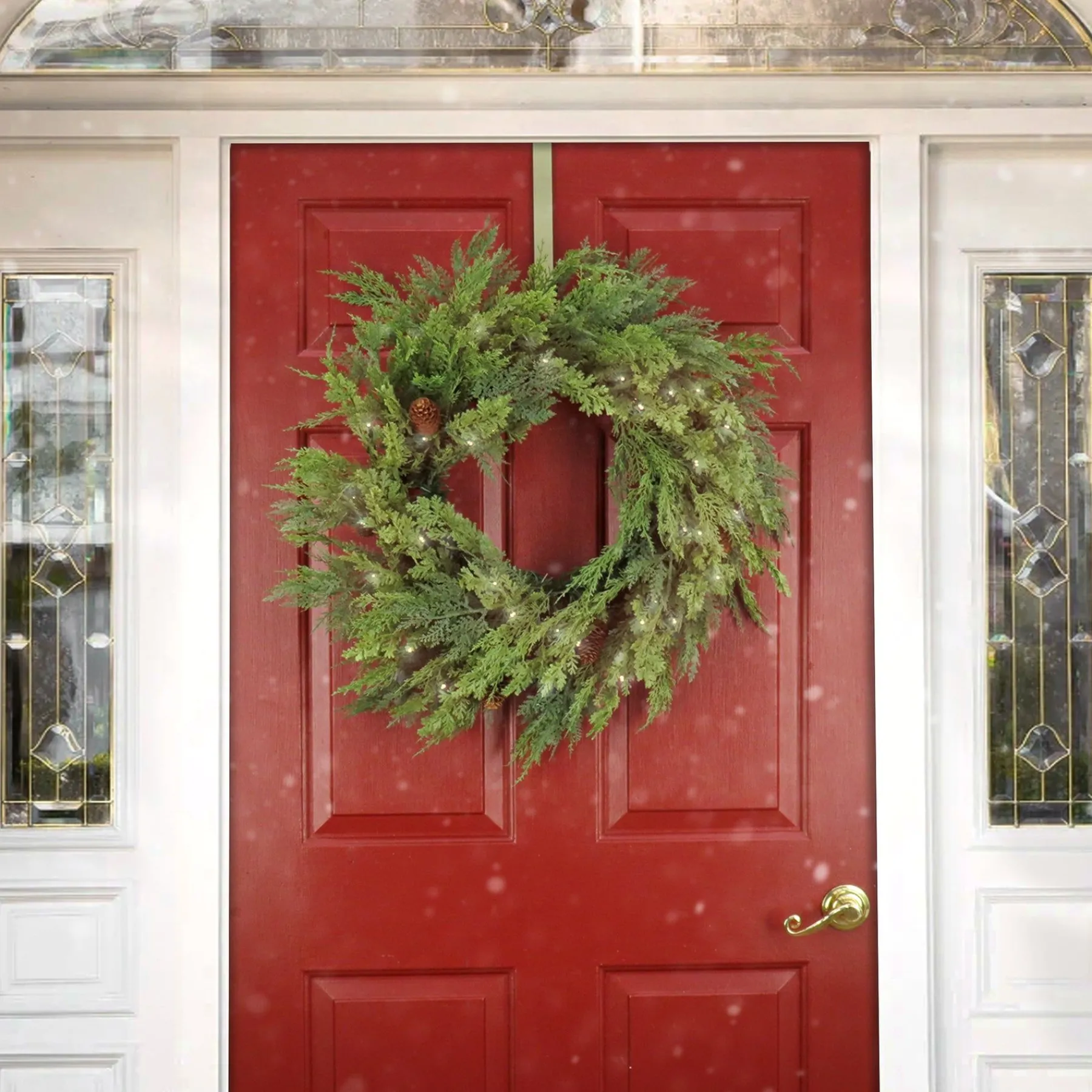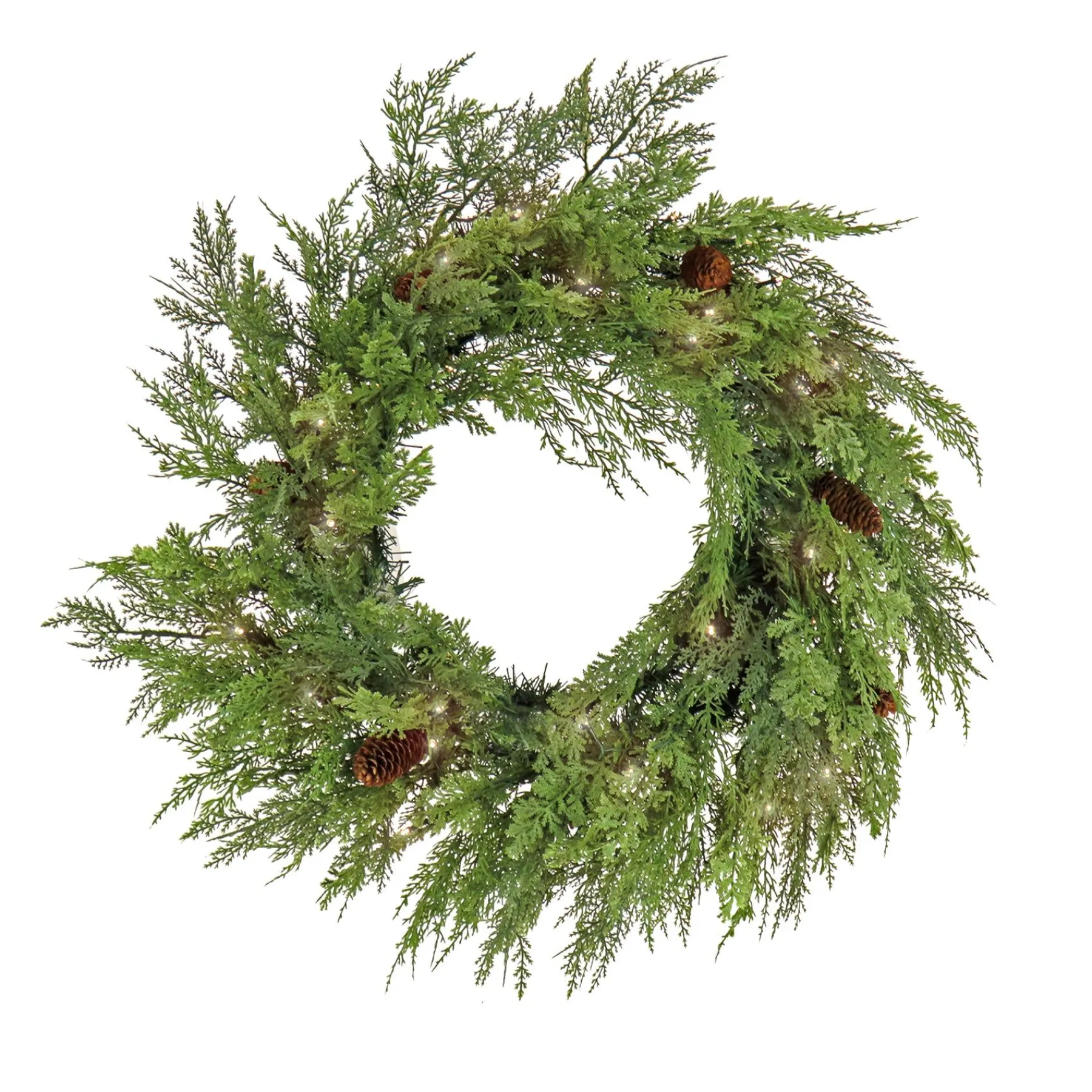 This Wreath Features A Mixture Of Leafy, Long-Stem Cedar Branch Tips Swirling Around A Sturdy Ring Base. It Is Trimmed With Pinecones That Add Contrasting Color And Natural Appeal. It Is Pre-Strung With 50 Battery-Operated Warm White Led Lights That Are Energy-Efficient And Long Lasting. 6 Hours On/18 Hours Off Timed Operation. This Wreath Can Be Displayed On Door, Wall, Or Window In Indoor Or Covered Outdoor Locations.