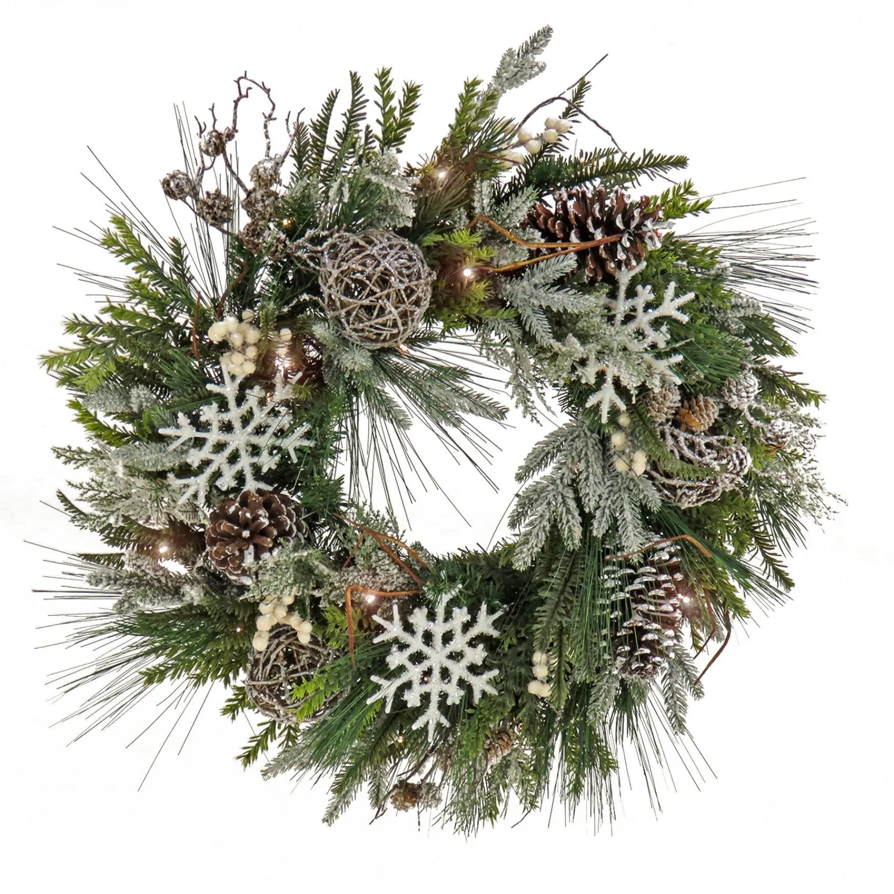 This Wreath Features A Mixture Of Evergreen, Bristle, And Cedar Branch Tips Trimmed With Pinecones And Berry Clusters. It Is Decorated With Glittered Snowflakes And Twig Ball Ornaments That Add A Festive Flavor. It Is Pre-Strung With 30 Battery-Operated Warm White Led Lights That Are Energy-Efficient And Long Lasting. 6 Hours On/18 Hours Off Timed Operation. This Wreath Can Be Displayed On Door, Wall, Or Window In Indoor Or Covered Outdoor Locations.