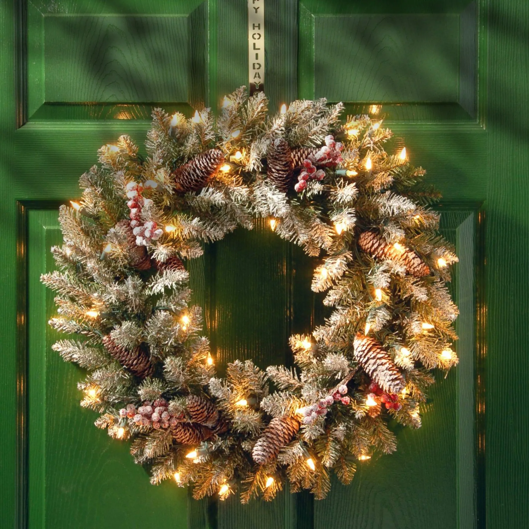 The Dunhill Fir Features Snow-Tipped Branches And Is Trimmed With Red Berries And Pinecones For Added Color And Depth. It Is Pre-Lit With 50 Clear Lights That Remain Lit Even If A Bulb Burns Out. Display This Wreath On Door, Wall Or Window In Indoor Or Covered Outdoor Locations.