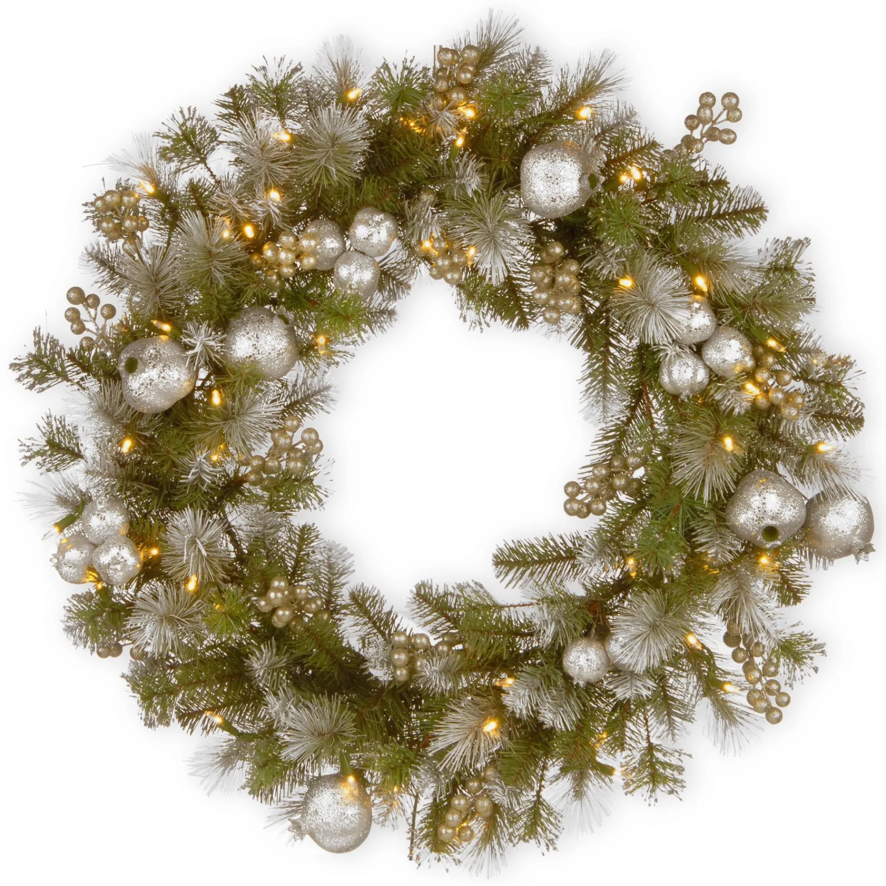 - Designed With A Glittery Pomegranate Pine Base, This Pre-Lit Artificial Christmas Wreath Is 24 Inches Wide And Decorated With Silver Pomegranates And Berry Clusters.