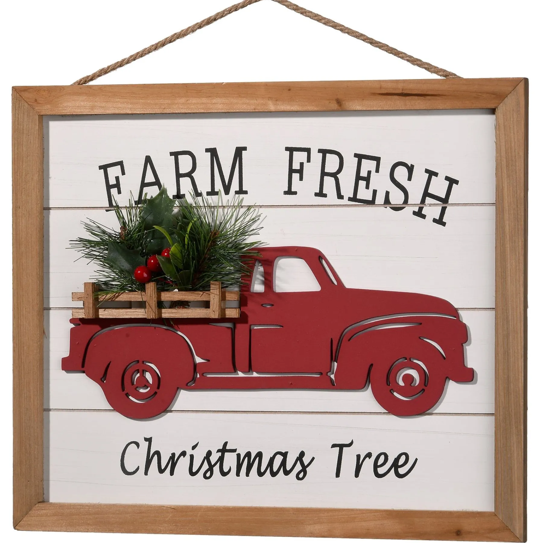 Welcome Visitors During The Holiday Season With This Shadowbox Style Wall Hanging Featuring 3D Components. This Framed Art Is Designed With Rustic Charm Announcing “Farm Fresh Christmas Tree”, Centered With A Raised Cut-Out Red Pick-Up Truck Including Raised Wood Rail, And Carrying Evergreens And Berries. It Is Constructed Of Lightweight Wood Composite Material And Includes A Sisal String Loop For Hanging.
