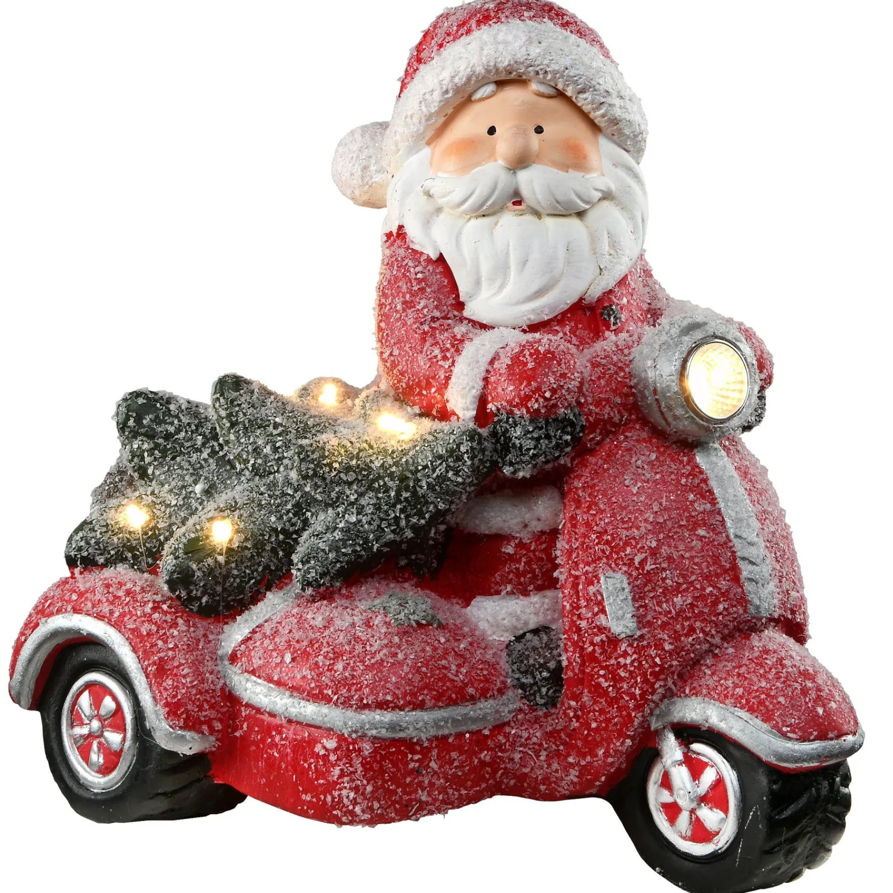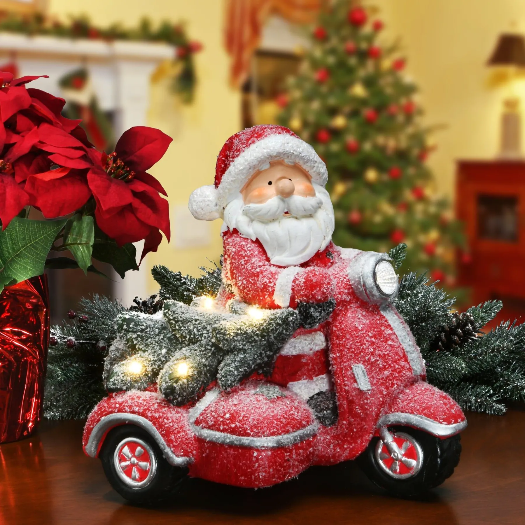 This Decorative Seasonal Piece Is Constructed Of Strong Poly Resin Material Featuring Handcrafted And Hand-Painted Detail. A Snow-Sprinkled Santa Is Seated On A Bright Red Motorbike Carrying An Evergreen Tree In His Sidecar. Battery Powered Led Light Shines From Inside Through The Bike Headlight And Cutouts In The Tree For A Soft Glow.