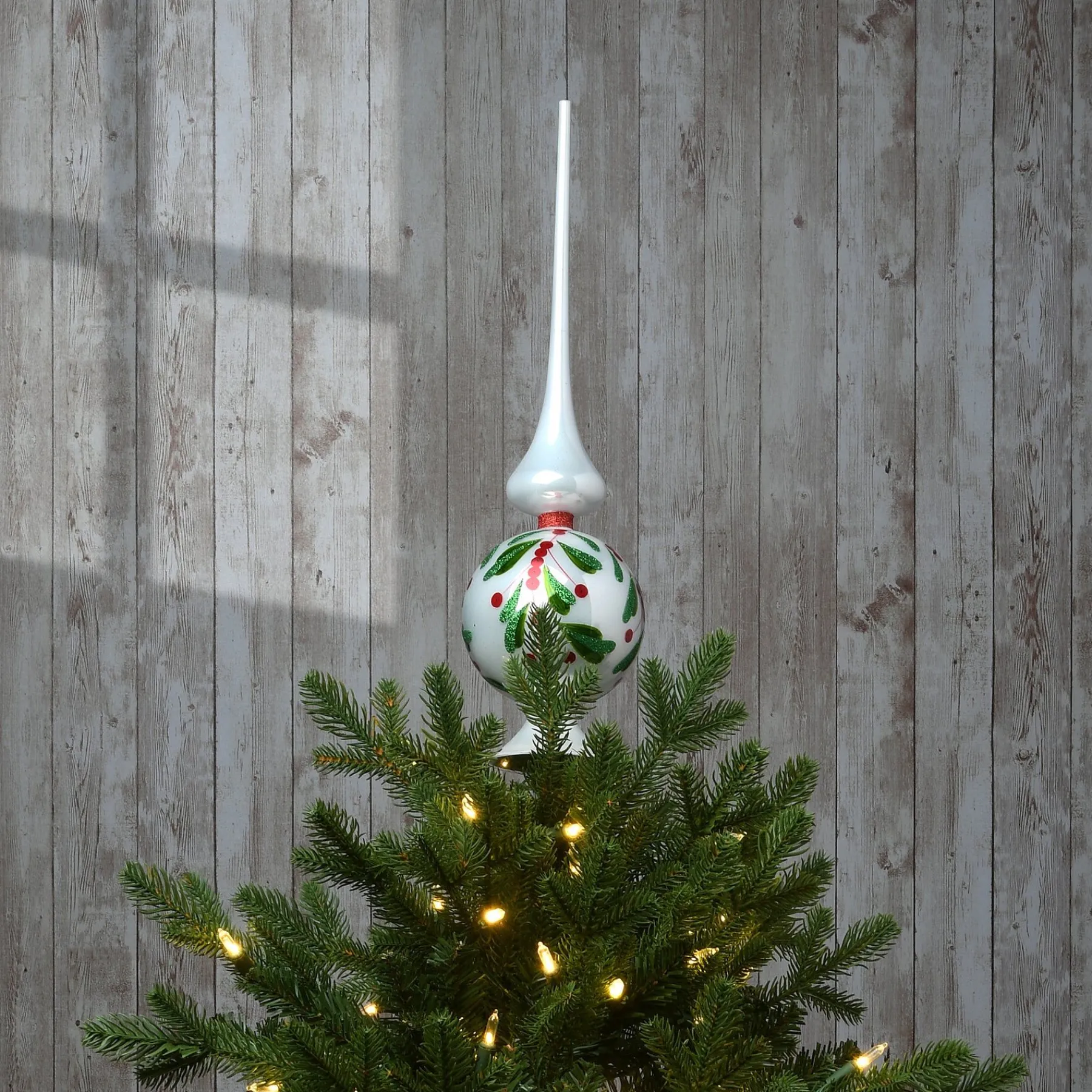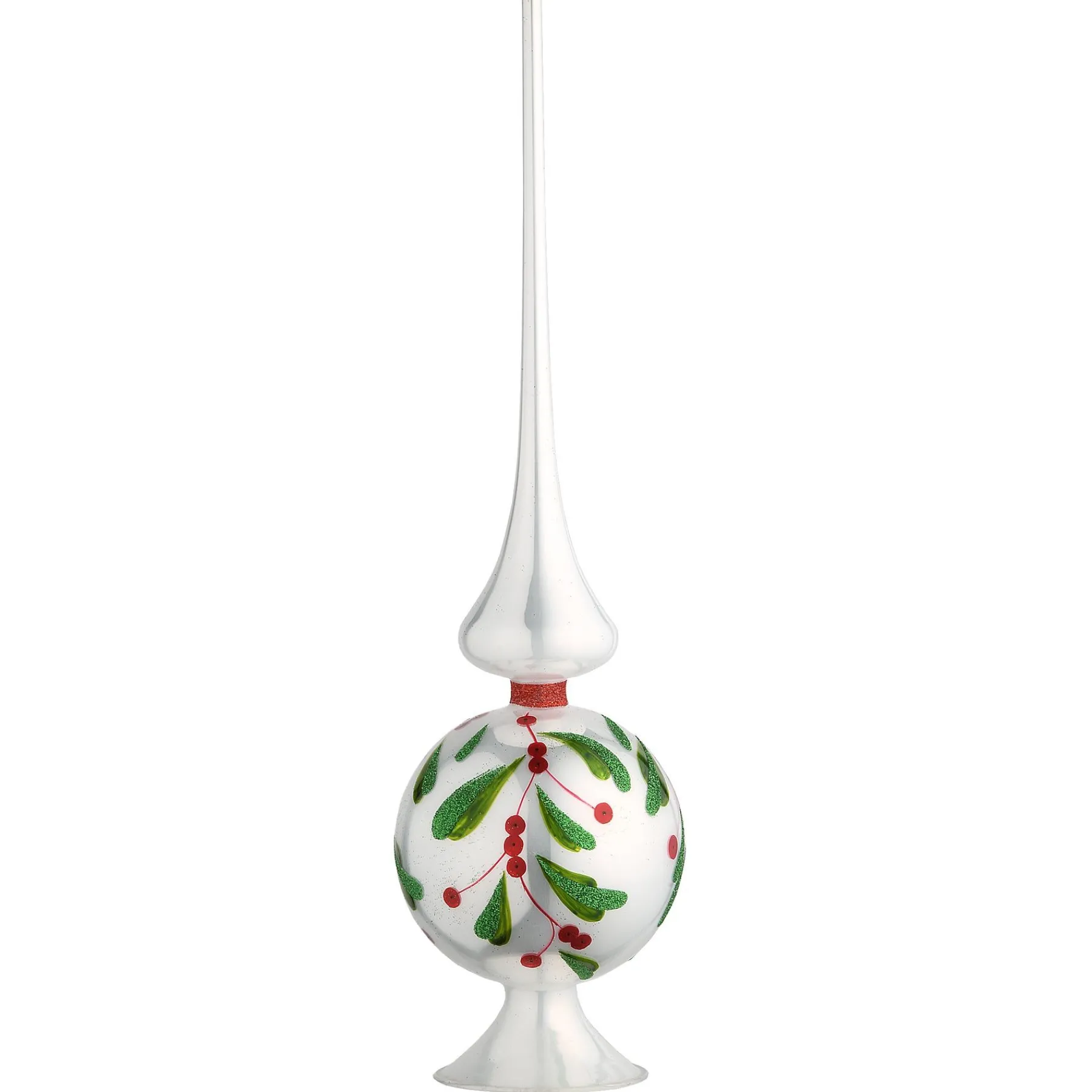 This Blown Glass Christmas Tree Top Ornament Features The Classic Ball And Spire Styling Designed To Complete Your Tree Decorating With An Artistic And Elegant Flare. A Motif Of Green Holly Leaves And Red Berries Are Hand-Painted On The Ball Of This Tree Top Decoration With Bright White Gloss Finish. This Tree Finial Is Sure To Become A Treasured Holiday Heirloom Ornament For Many Years To Come.
