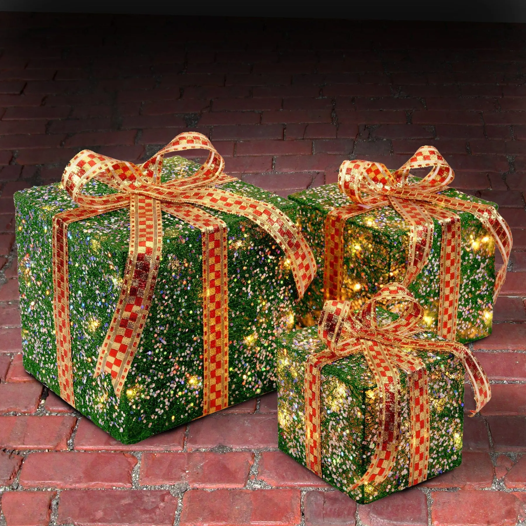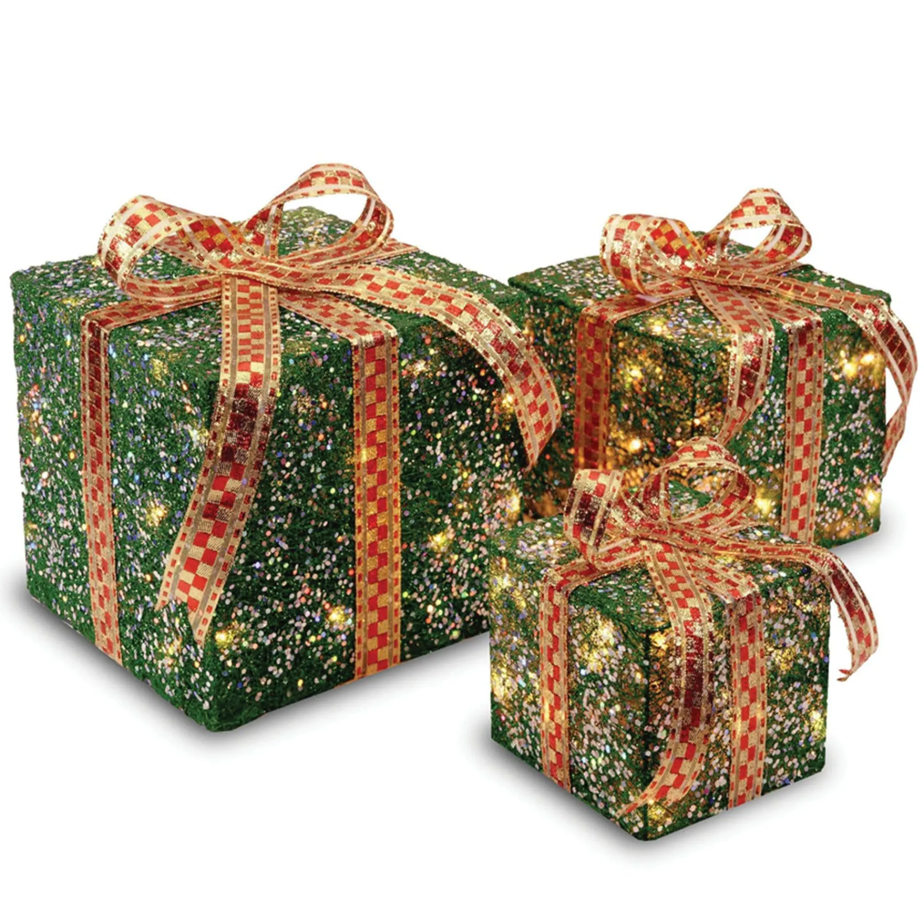 - Made From Green And Gold Sisal Thread, These Six, Eight And Ten Inch Gift Boxes Feature 75 White Lights. The Boxes Are See Through And Allow The Strings Of Led Lights Inside To Shine Through And Cast Small Shadows Along The Walls Of Your Home.