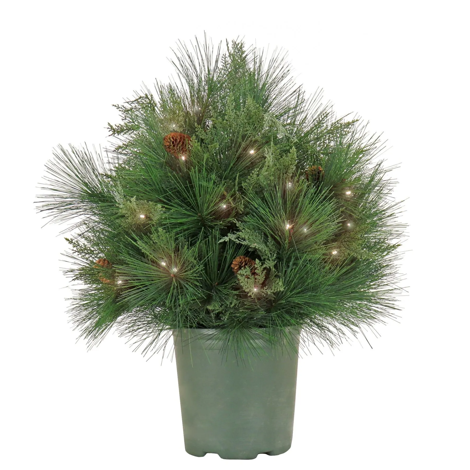 This Decorative Arrangement Features A Mixture Of Cedar And Bristle Branch Tips Trimmed With Pinecones For Added Natural Appeal. It Is Pre-Strung With 60 Battery-Operated Warm White Led Lights That Are Energy-Efficient And Long Lasting. 6 Hours On/18 Hours Off Timed Operation. This Attractive Greenery Is Seated In A Sturdy Pot Base That Allows The Whole Piece To Be Dropped Into A Decorative Planter For Display In Indoor Or Covered Outdoor Locations.