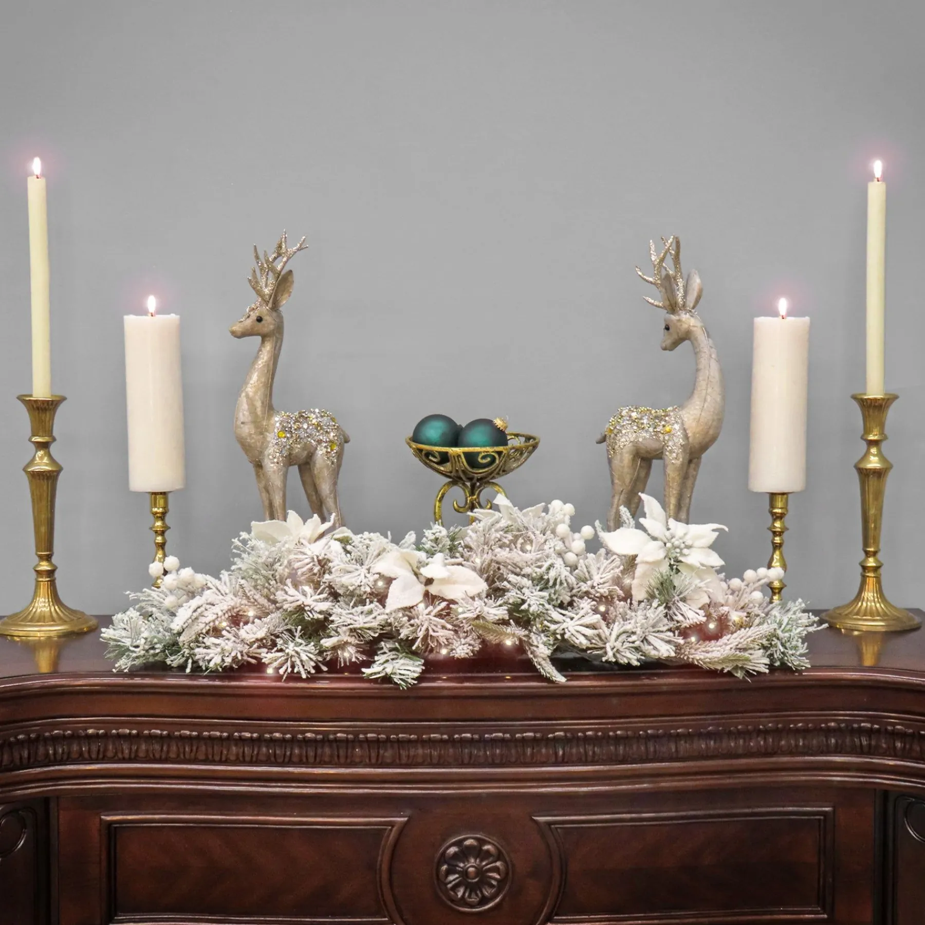 This Snow-Dusted Frosted Colonial Swag Decoration Features Feel Real Branch Tip Technology, Creating A Decoration With Remarkable Realism. This Mixed Tip Wreath Is Trimmed With Poinsettia Flowers And Berry Clusters And Pre-Strung With 50 Battery-Operated
