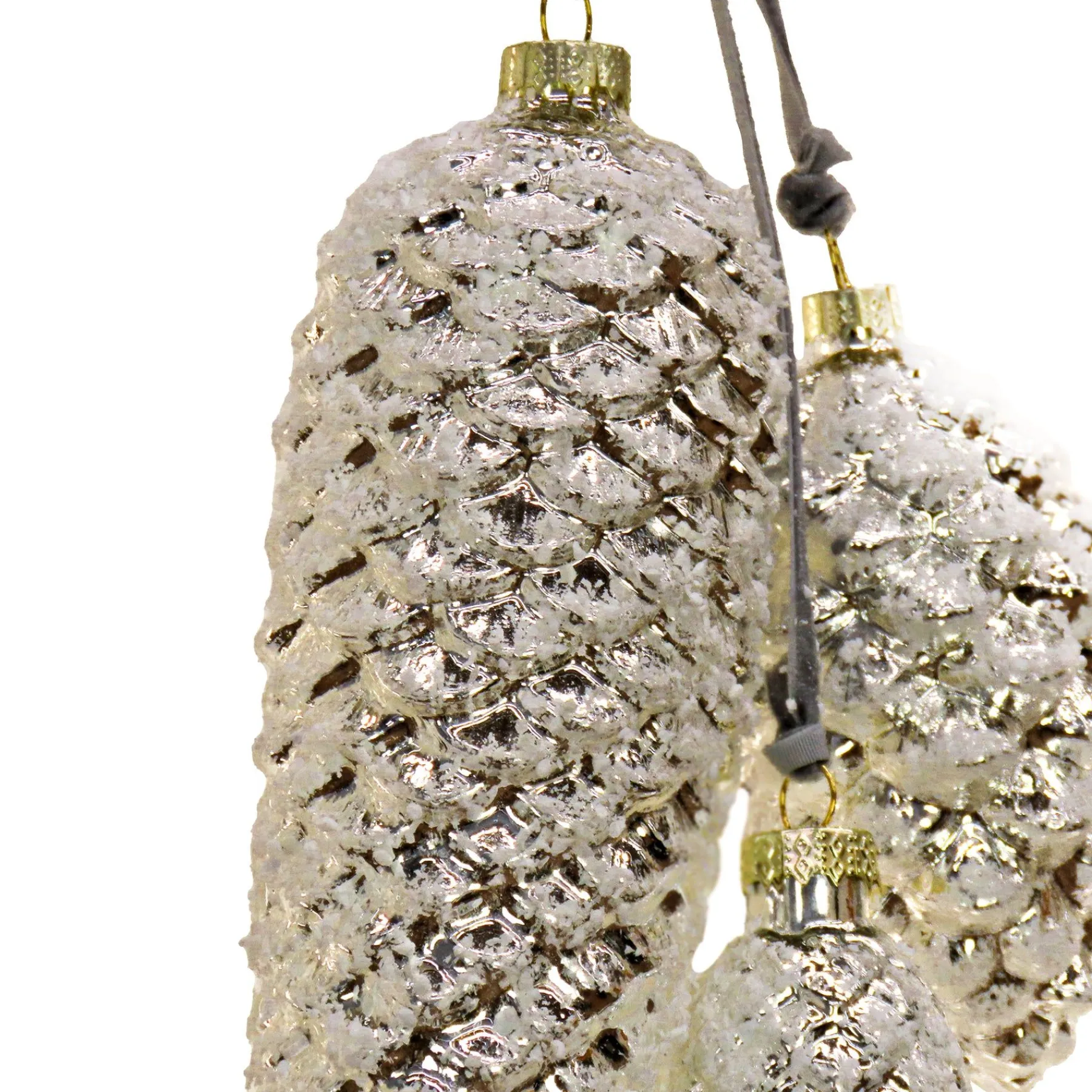 This Set Consists Of Two 3-Piece Clusters Of Pinecones In Varying Shapes And Sizes. All Of These Handcrafted Pinecones Are Constructed Of Glass And Feature A Snow-Dusted Sparkling Silver Finish. Each Group Of Ornaments Is Tied Together With Ribbon To A Main Hanging Loop. These Unique Decorations Will Add A Little More Sparkle To Your Holiday Tree Trimming.