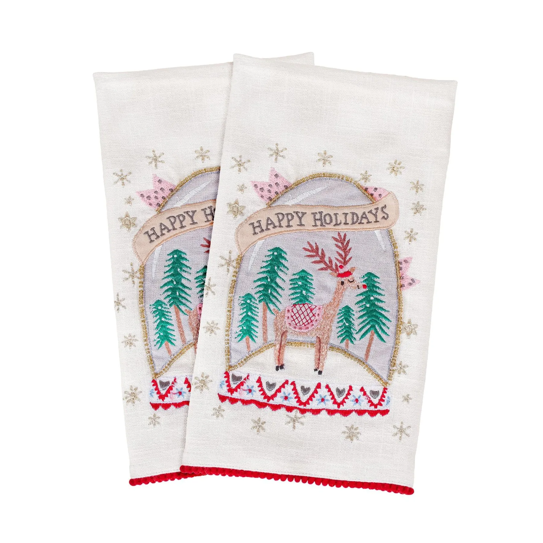 These Decorative Christmas Themed Towels Feature A Large Snow Globe Containing Evergreen Trees And A Reindeer And Is Wrapped With A Banner Reading “Happy Holidays”. Metallic Threads And Gold Beading Add Sparkle To The 100% Cotton Fabric Trimmed With A Complementing Bright Red Piping Edge. Add A Seasonal Splash To Kitchen Or Bath With These Fun And Whimsical Holiday Hand Towels.