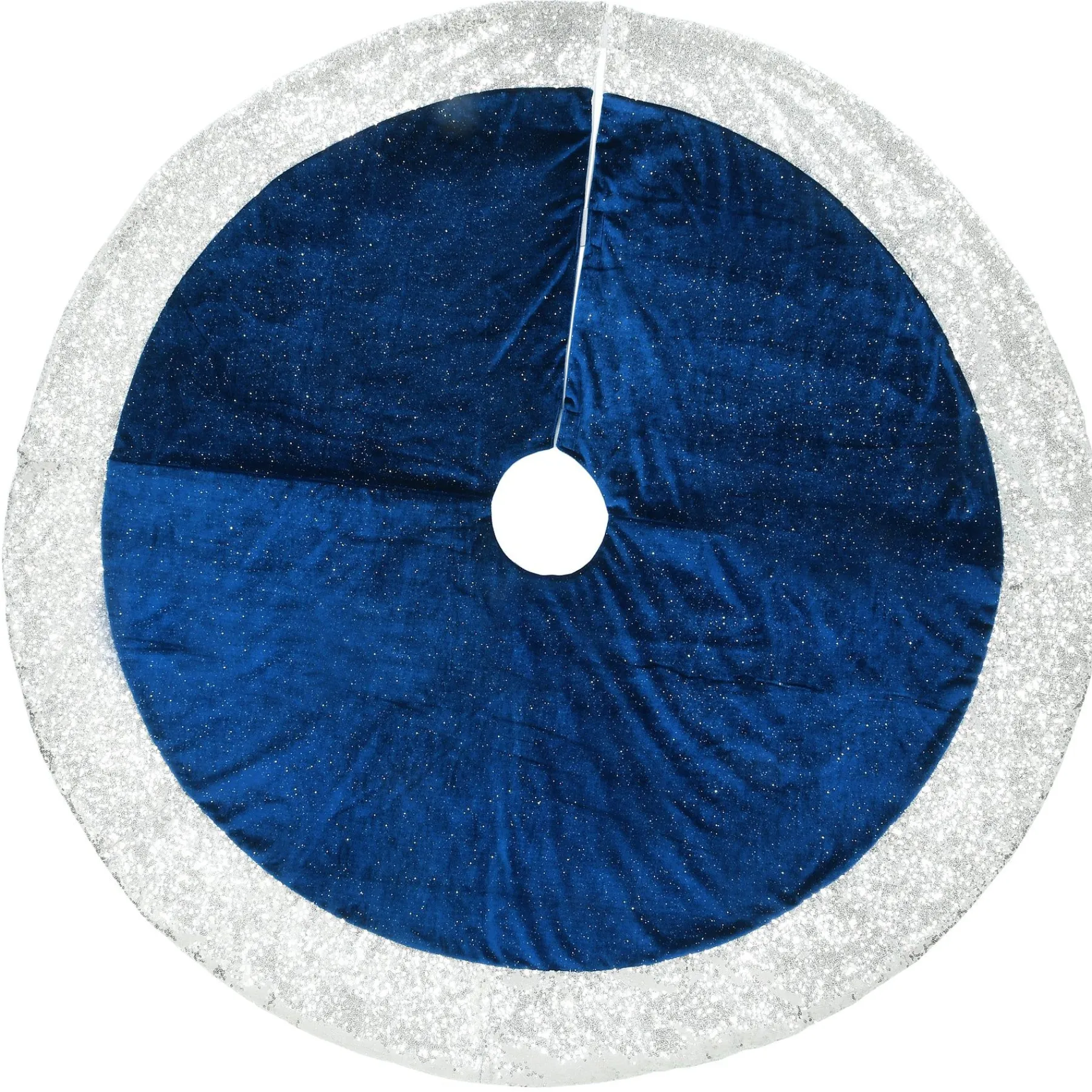 Add The Finishing Touch By Surrounding The Base Of Your Christmas Centerpiece With This Bright And Attractive Tree Skirt. Made Of 100% Polyester, This Skirt Features A Vibrant Navy-Blue Velvet Center And Silver Border Dotted With Glittering Sequins. The Split Seam Design Allows For Easy Placement With Velcro Tabs Included To Close And Secure The Seam.