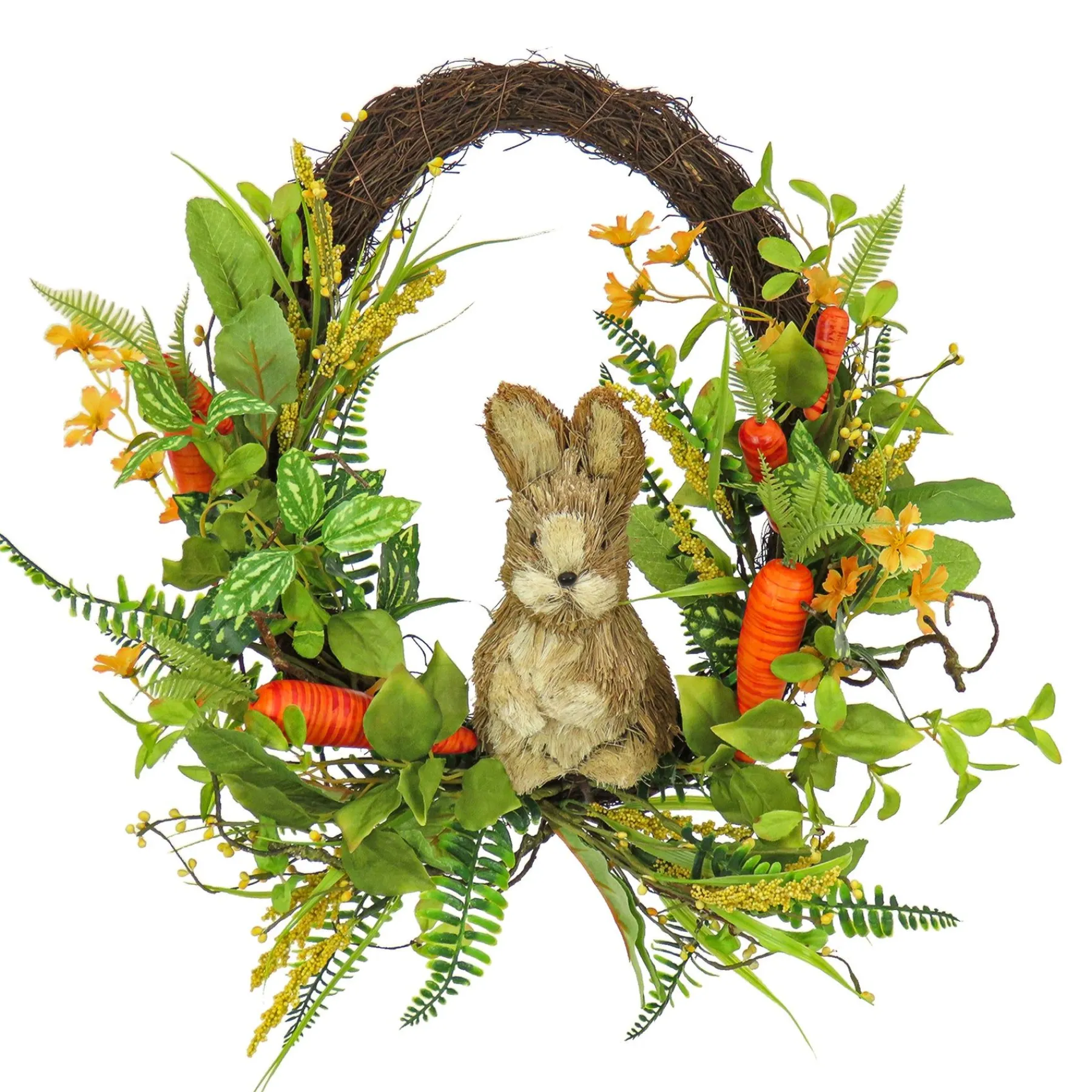 - This Artificial Hanging Wreath Is Decorated With An Assortment Of Miniature Orange Carrots, Fern Branches And Features A Swirl Of Long, Leafy Greens To Create An Additional Natural Appeal