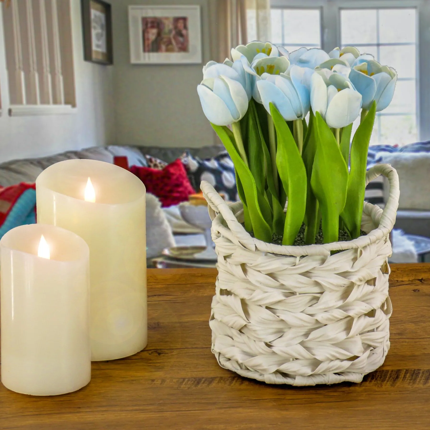 This Tight Bouquet Of Light Blue Tulip Blooms With Tall Leafy Stems Rises From A White Basket With A Wide Weave And Two Loop Handles. The Flowers Are Seated In A Simulated Soil Surface. Add Soft Natural Color To Tabletop Trimmings With These Attractive Artificial Flowers That Are Remarkably Life-Like Yet Maintenance-Free. For Decorative Indoor Display.