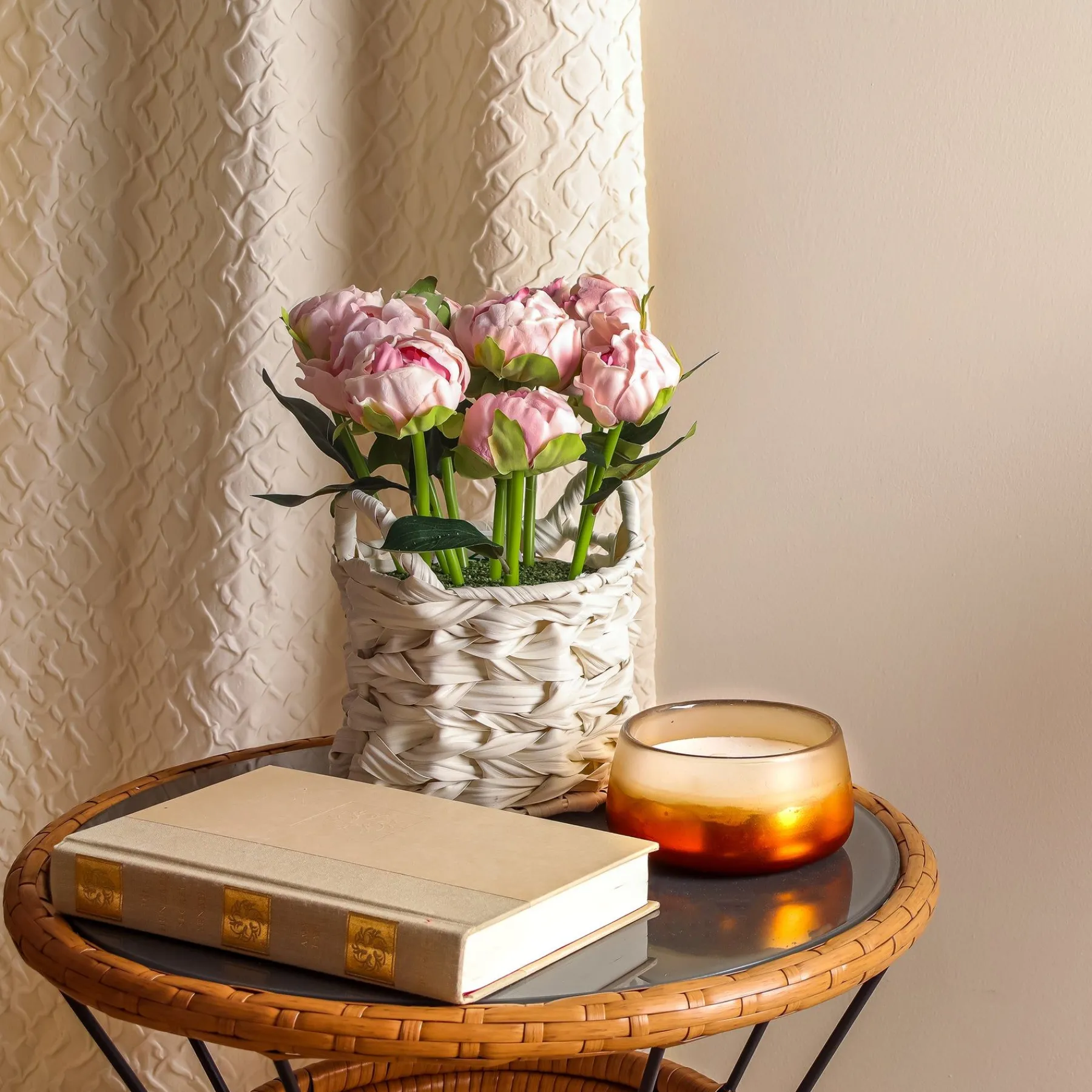 This Bouquet Of Light Pink Peony Flower Blooms On Leafy Green Stems Rises From A White Basket With A Wide Weave And Two Loop Handles. The Flowers Are Seated In A Simulated Soil Surface. Add A Burst Of Color To Tabletop Trimmings With These Attractive Artificial Flowers That Are Remarkably Life-Like Yet Maintenance-Free. For Decorative Indoor Display.