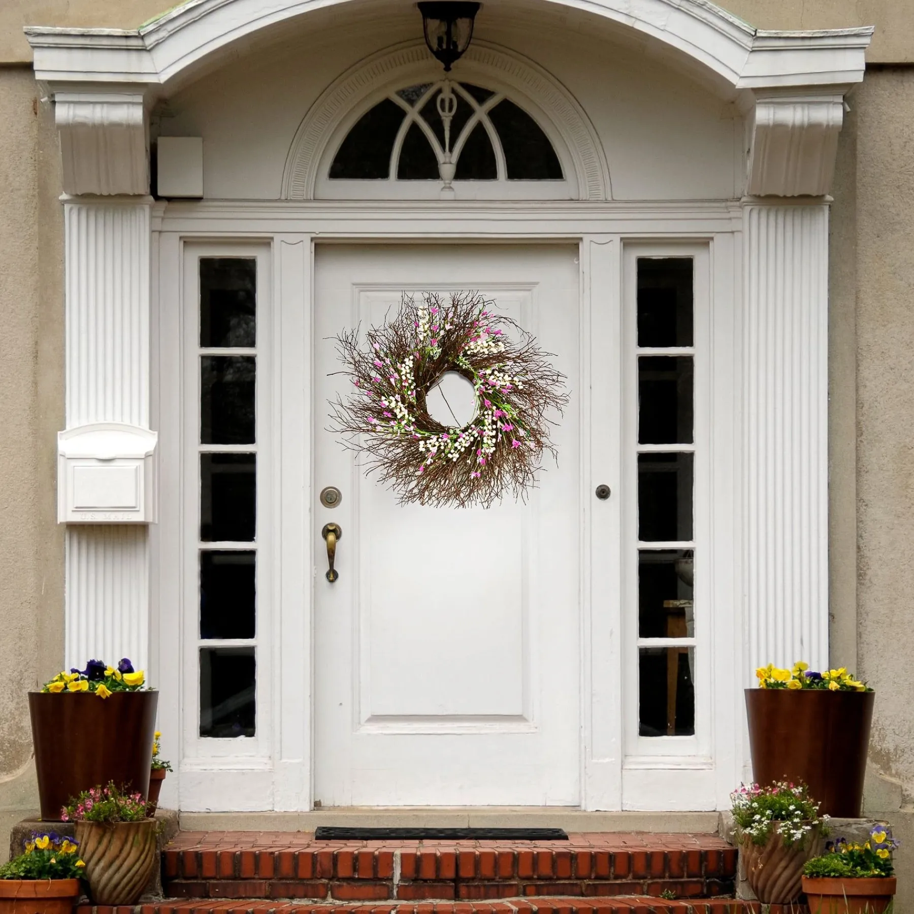 This Wreath Features A Swirl Of Bristle Twigs Spiraling Out From A Woven Branch Ring Base. It Is Decorated With Dark Pink And Cream-Colored Forsythia Flowers Atop Long Flowing Stems. A Mixing Of Berry Clusters And Leafy Greens Add Natural Appeal And Complimenting Colors. Display This Attractive Decoration On Doors, Walls And Windows In Indoor Or Covered Outdoor Locations.