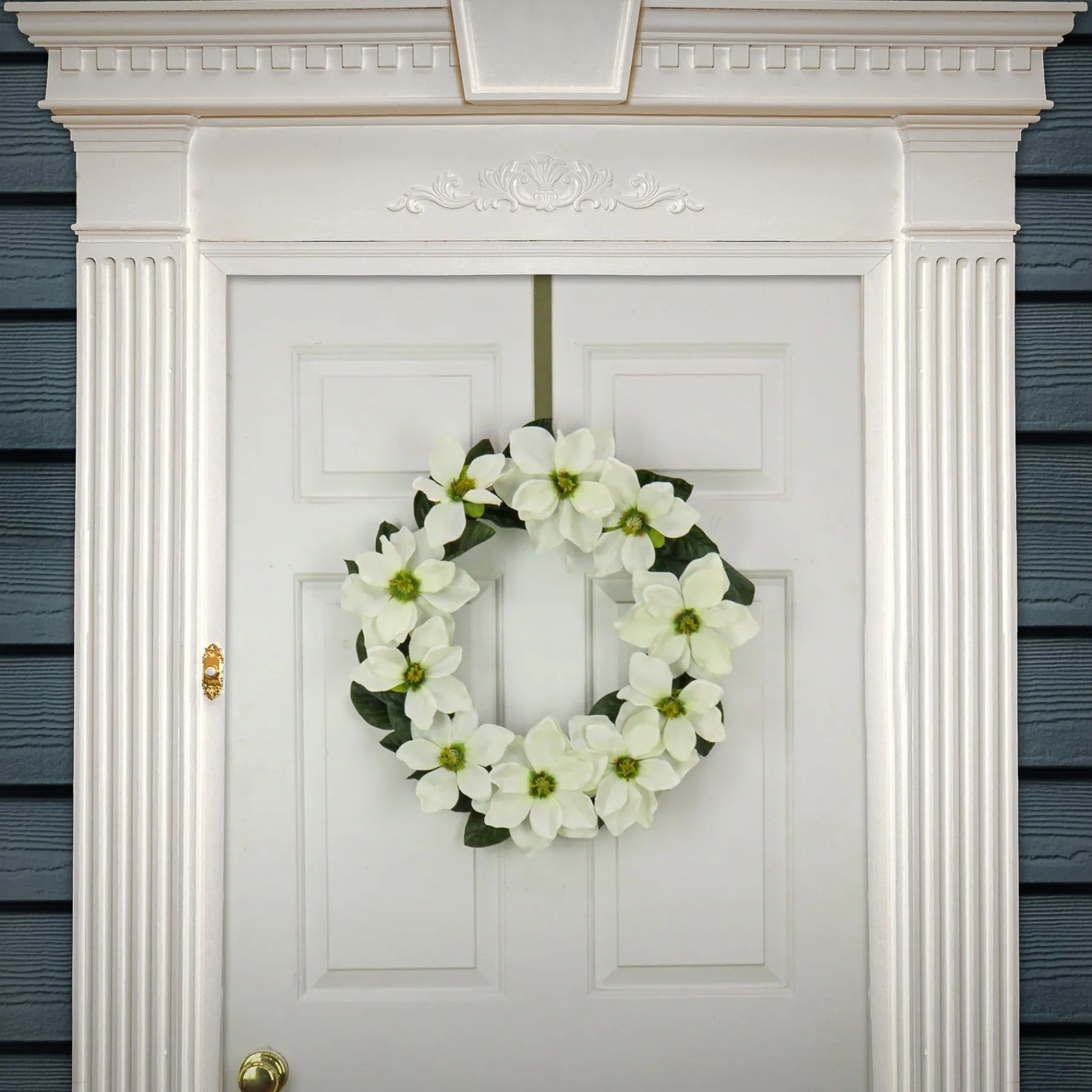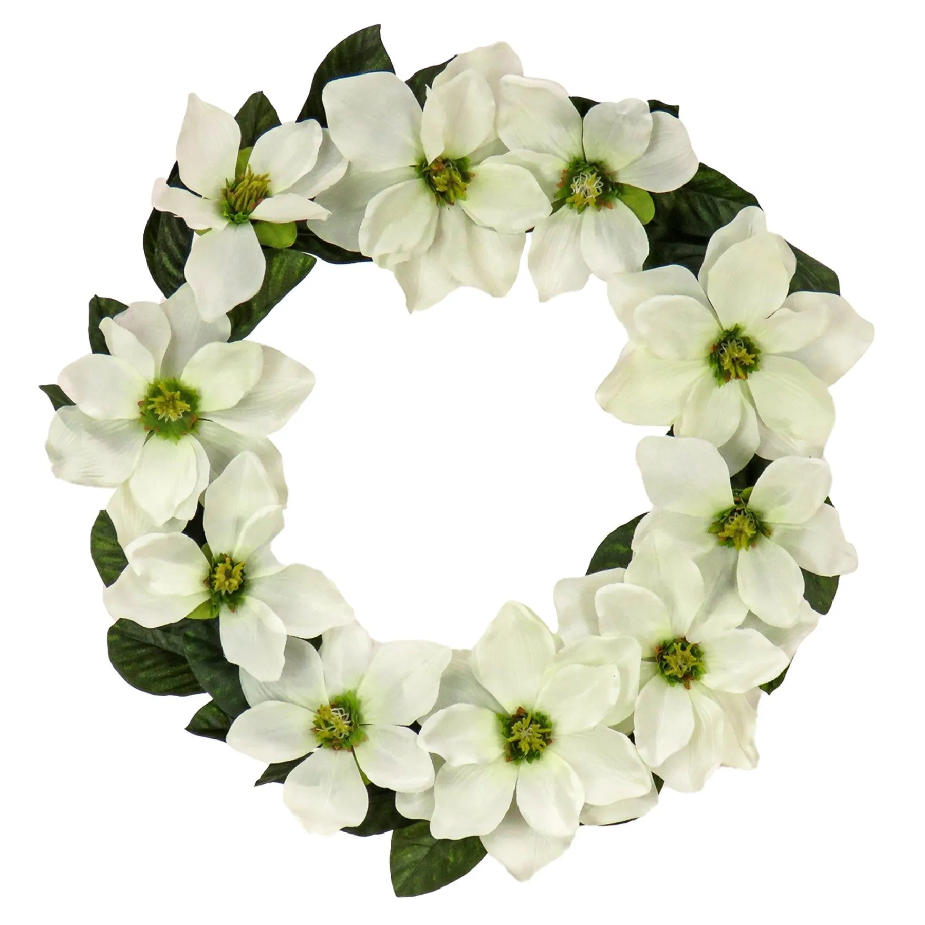The Wreath Features Big Bright Cream-Colored Magnolia Blooms Sprouting From A Vine Ring Base. A Background Of Contrasting Broad-Width Dark Green Leaves Add Natural Appeal. Display This Cheerful Flowering Wreath On Door, Wall, Or Window In Indoor Or Covered Outdoor Locations.