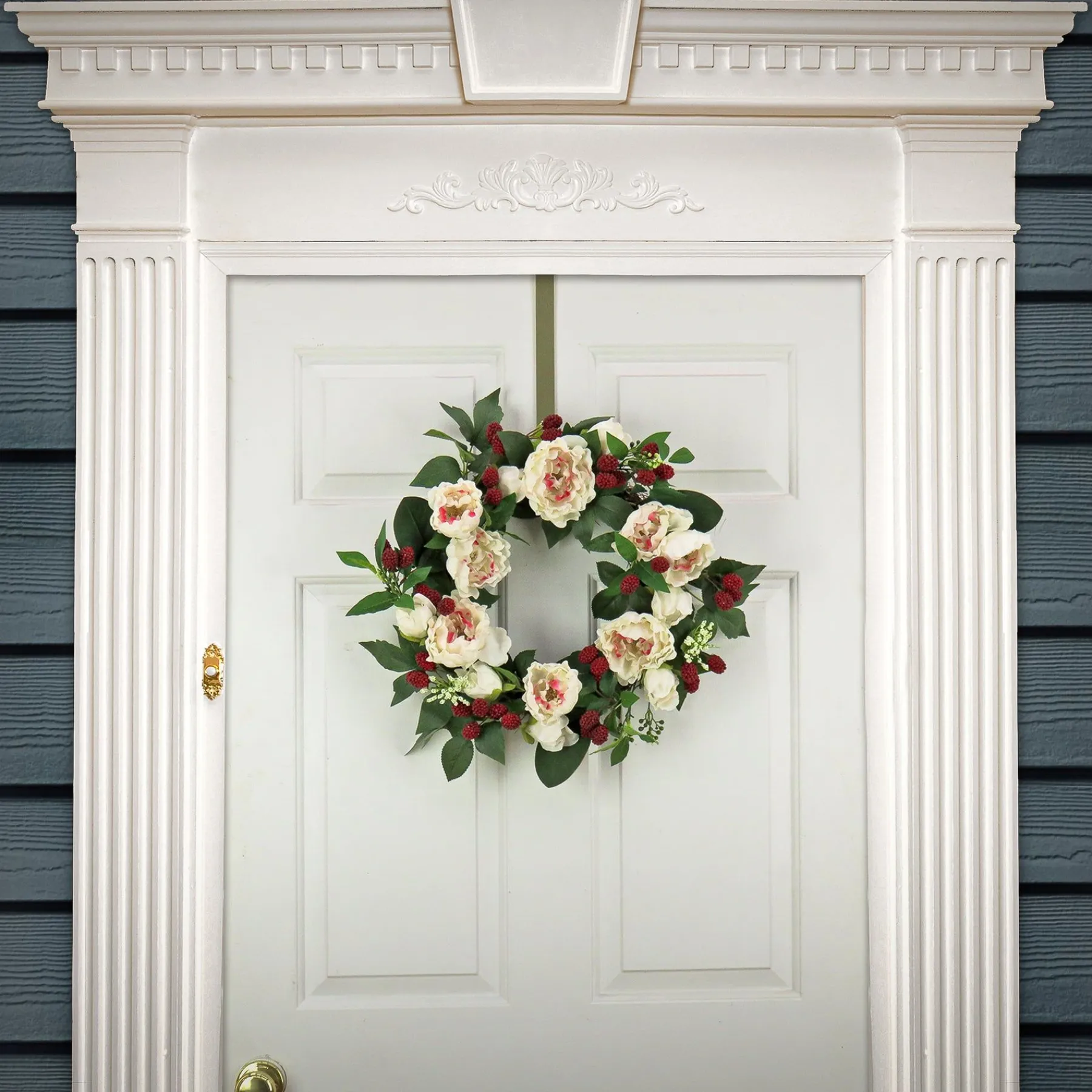 This Wreath Features A Swirl Of Broad Leaf Greenery Bursting With Cream-Colored Peony Flower Blooms. It Is Trimmed With Groups Of Bright Red Raspberries As Well As Smaller Berry Clusters That Add Complementing Colors. A Naturally Appealing Thick Woven Branch Ring Base Anchors This Attractive Decoration, Designed For Spring And Summer Season Display. Hang On Door, Wall, Or Window In Indoor Or Covered Outdoor Locations.