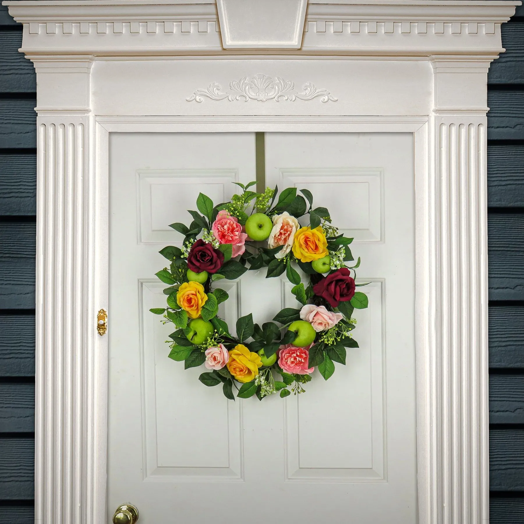 - This Artificial Hanging Wreath Is Decorated With An Assortment Of Colorful Rose And Peony Blooms, Miniature Green Apples And Features A Swirl Of Assorted Long, Leafy Greens To Create An Additional Natural Appeal
