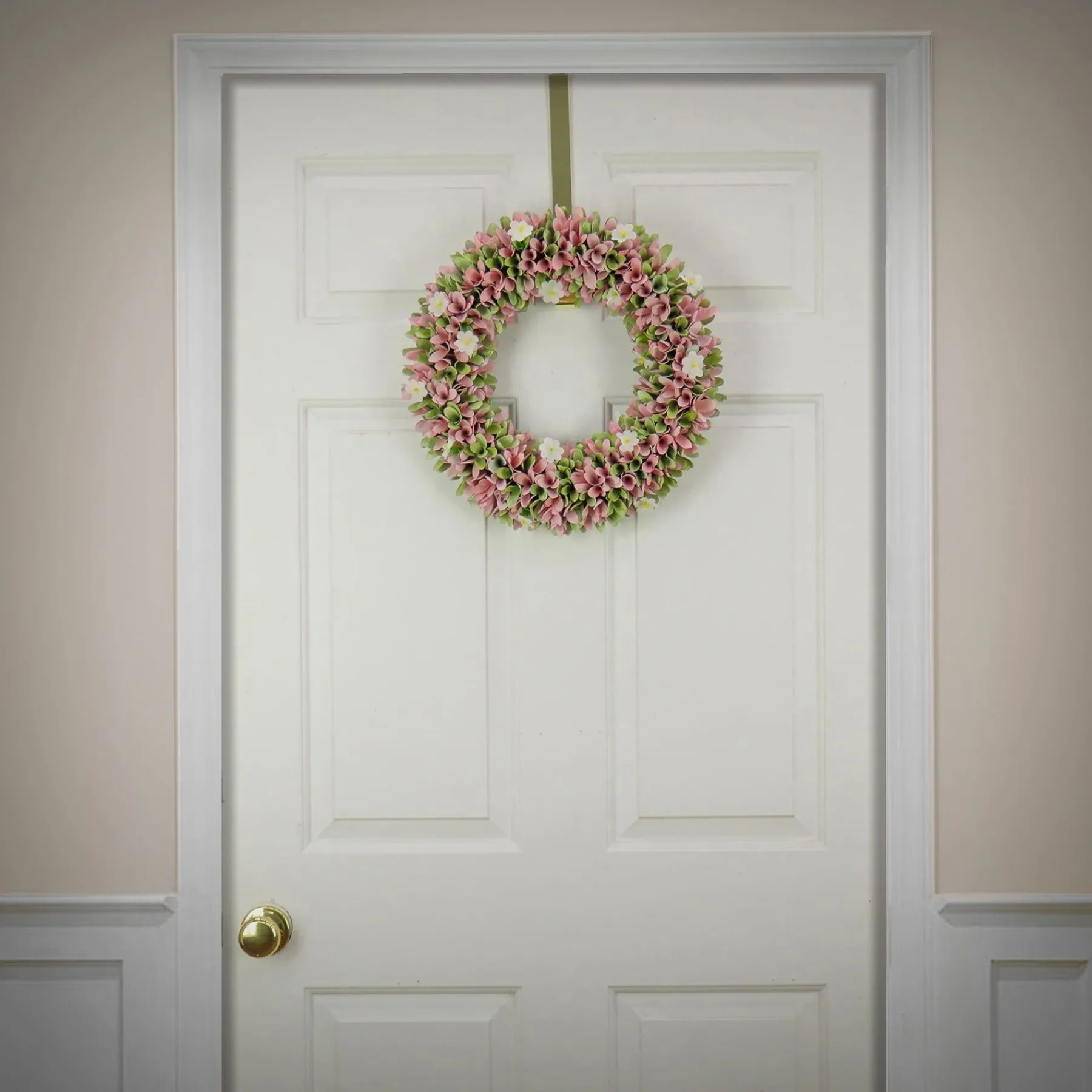- This Artificial Wreath Decoration Is Decorated With Pink And Green Assorted Wood Cut Flowers And Flowing Green Leaves