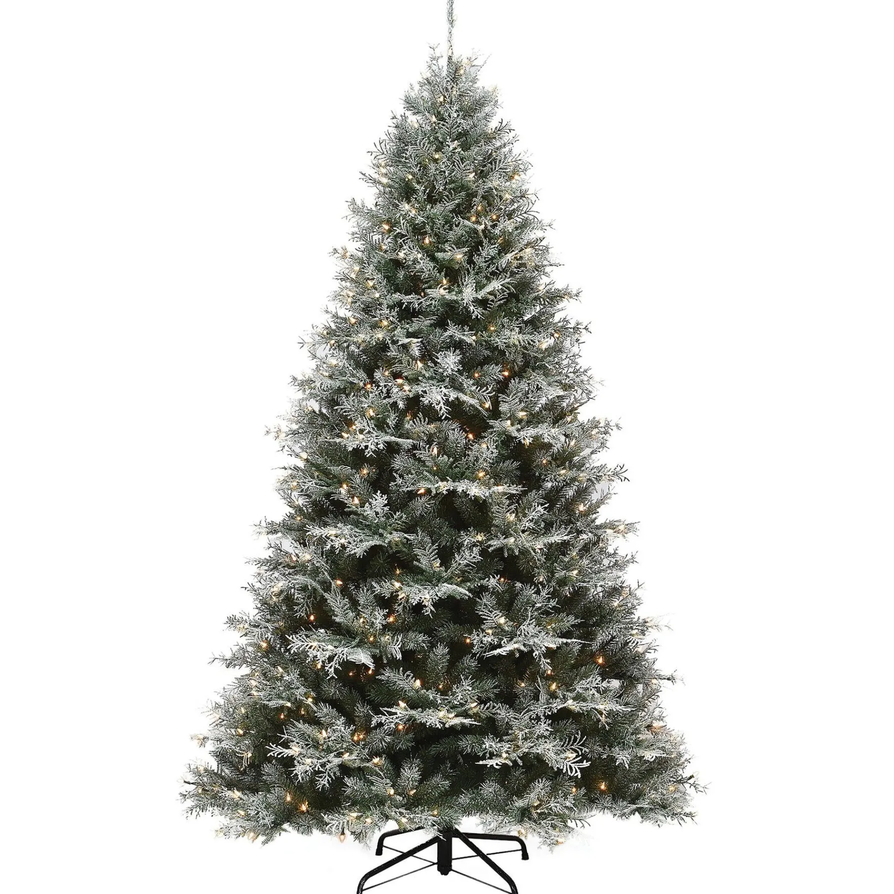 - This Snowy Stonington Fir Pre-Lit Artificial Green Christmas Tree Is 7.5 Feet Tall With A 58 Inch Base Diameter. Featuring Hundreds Of ‘Feel Real’ Individually Crafted Branch Tips To Create Full Bodied Branches, This Tree Is Designed To Look And Feel Life