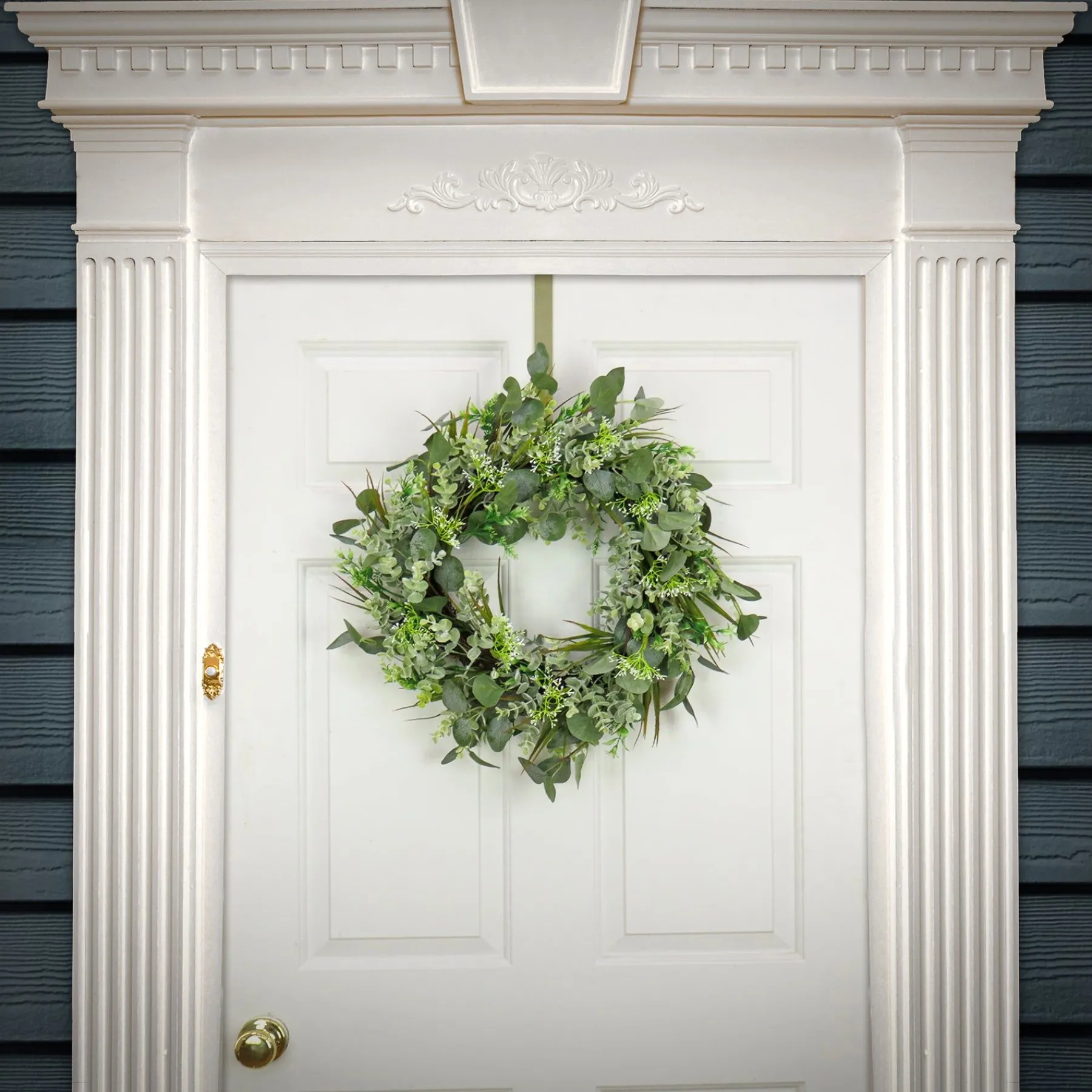- This Artificial Wreath Decoration Is Decorated With Green Eucalyptus Leaves And Flowing Green Stems.