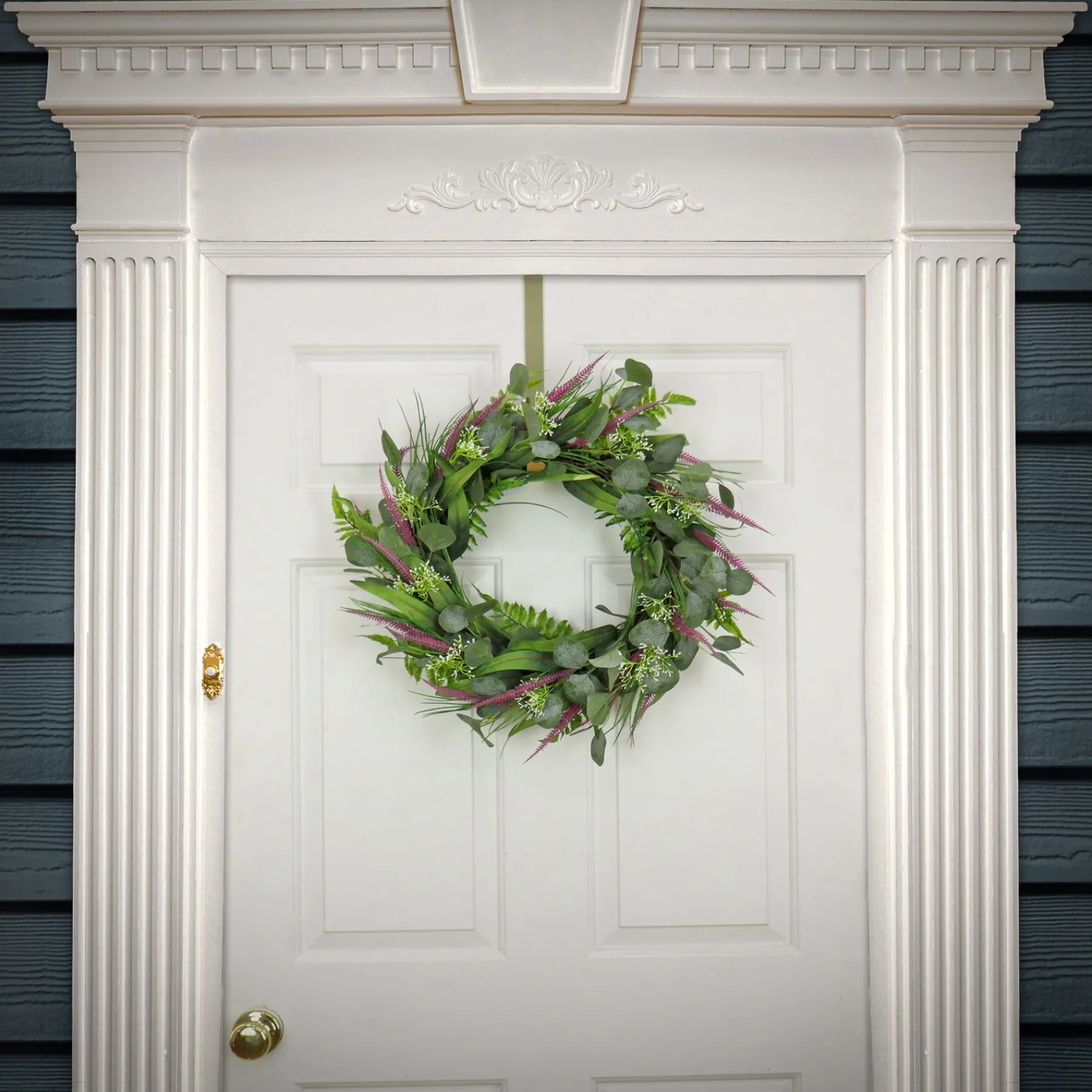 - This Artificial Wreath Decoration Is Decorated With Green Eucalyptus Leaves, Lavender And Flowing Green Stems.