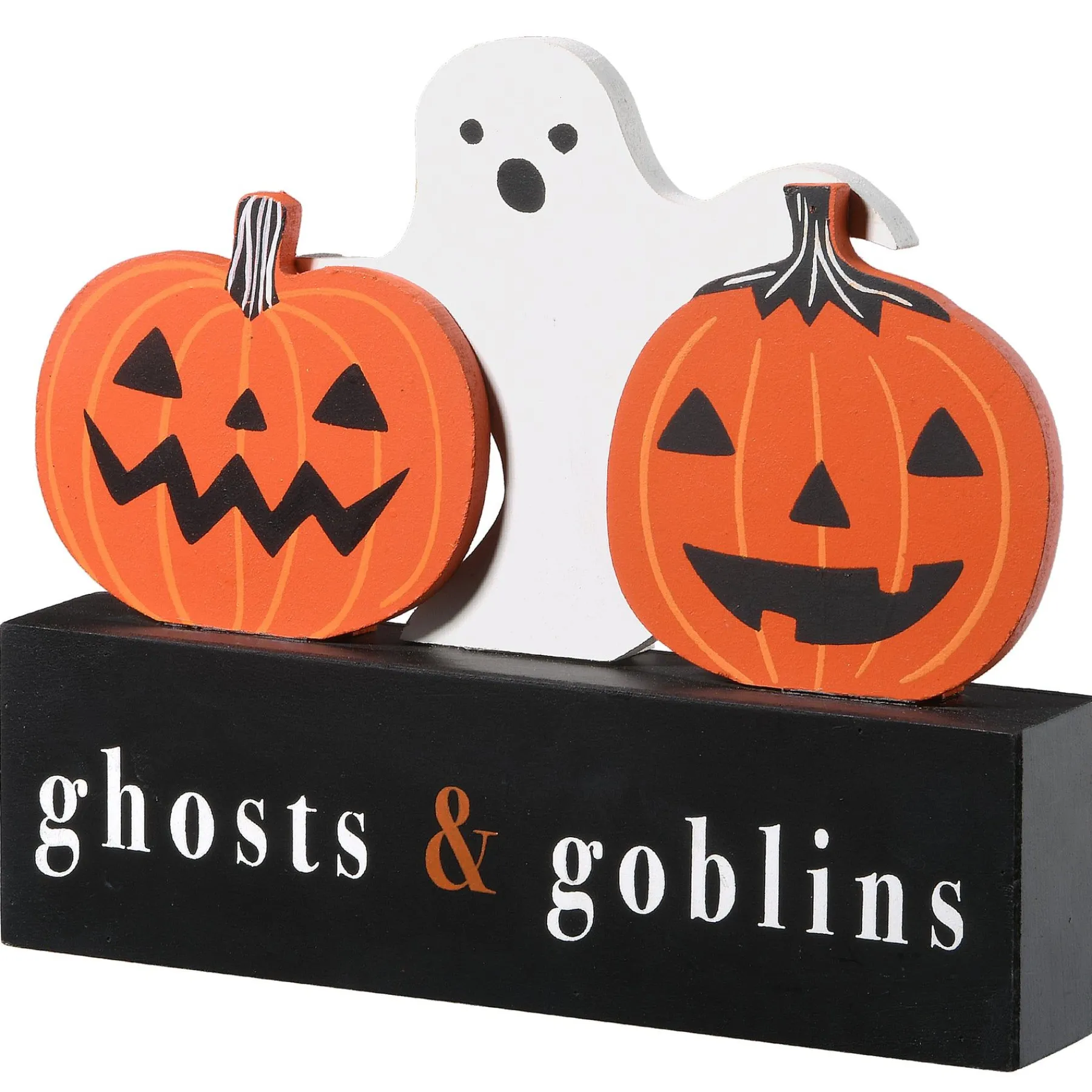 - Halloween Themed Standing Decoration Depicting Two Jack O’ Lanterns And A Ghost Standing On A Black Rectangular Box That Reads “Ghosts And Goblins”.