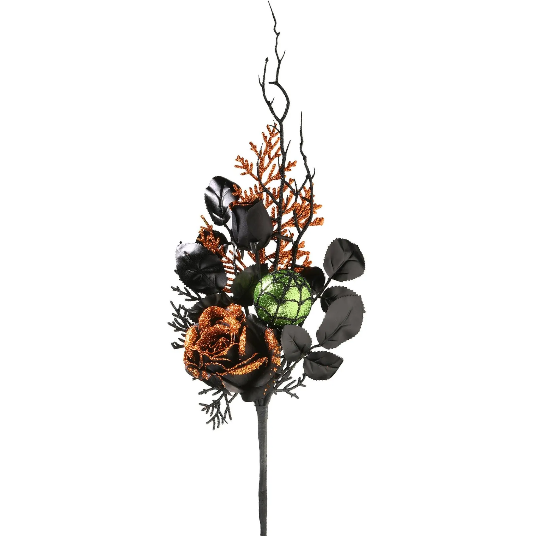 - Halloween Themed Set Of Two Artificial Bouquets Decorated With Rose Flowers Blooms And Webbed Green And Orange Ball Ornaments And Trimmed With Twigs, Leaves And Fronds.